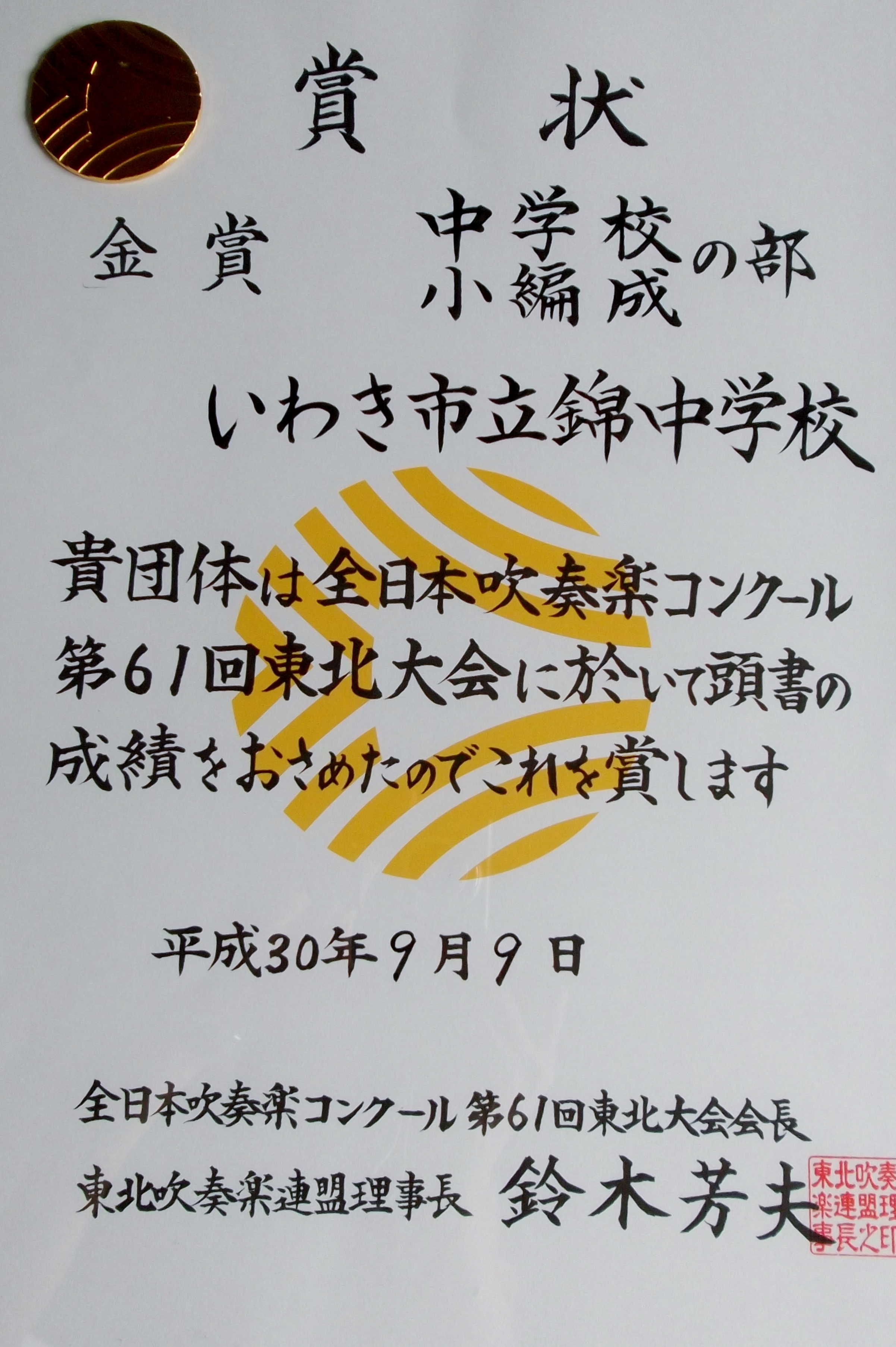 平成30年9月9日(土)、全日本吹奏楽コンクール第61回東北大会が岩手県北上市文化交流センターで開催され、錦中吹奏楽部が金賞を受賞しました。その演奏は、市、県、東北と大会を重ねるにつれて、練り上げられ、響きにゆとりが感じられるものでした。とても、緊張感があり、さらに集中力が高くなっていました。中学生とは思えないほどの実力との声もありました。今後、10月13日(土)に開催される第18回東日本学校吹奏楽大会への出場となります。会場は、宮城県仙台銀行ホールです。さらなる素晴らしい演奏を期待しています。東北大会出場にあたり、保護者の方々の多大なるご協力があったことに感謝いたします。