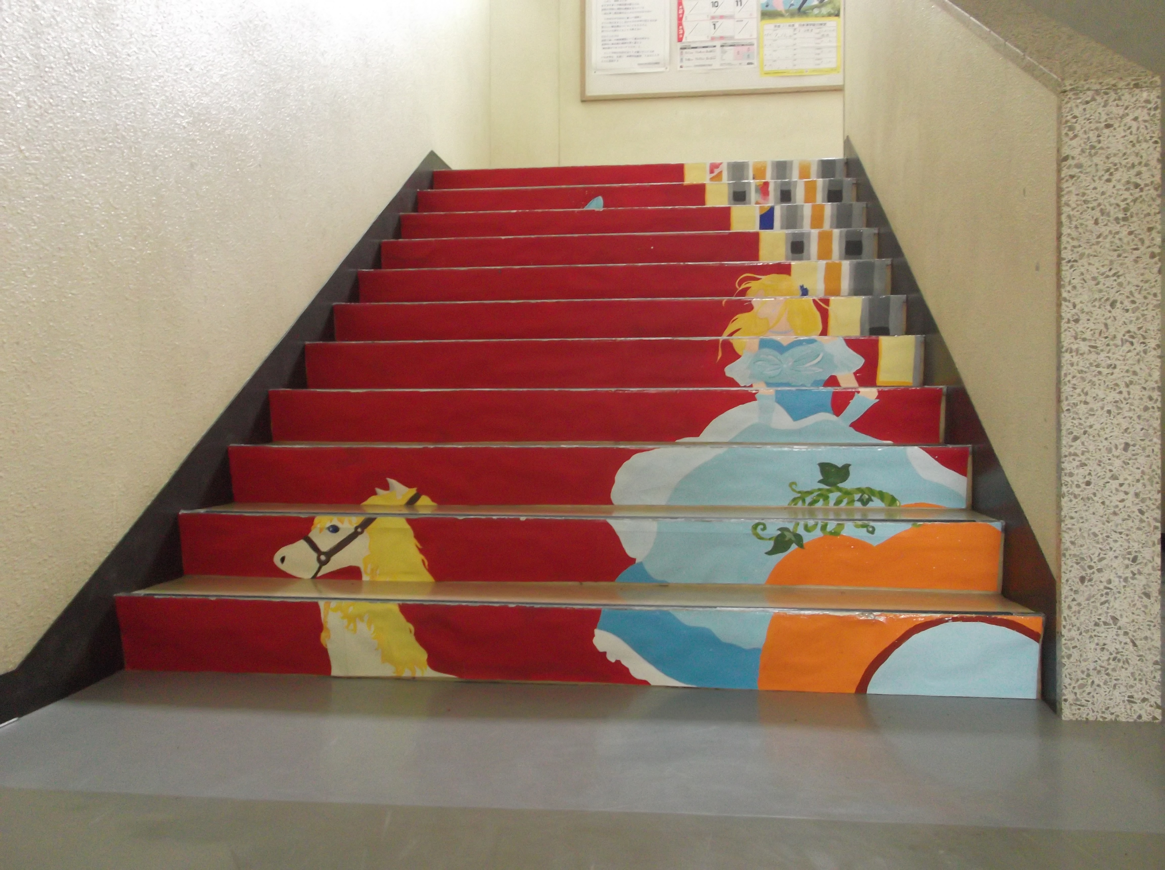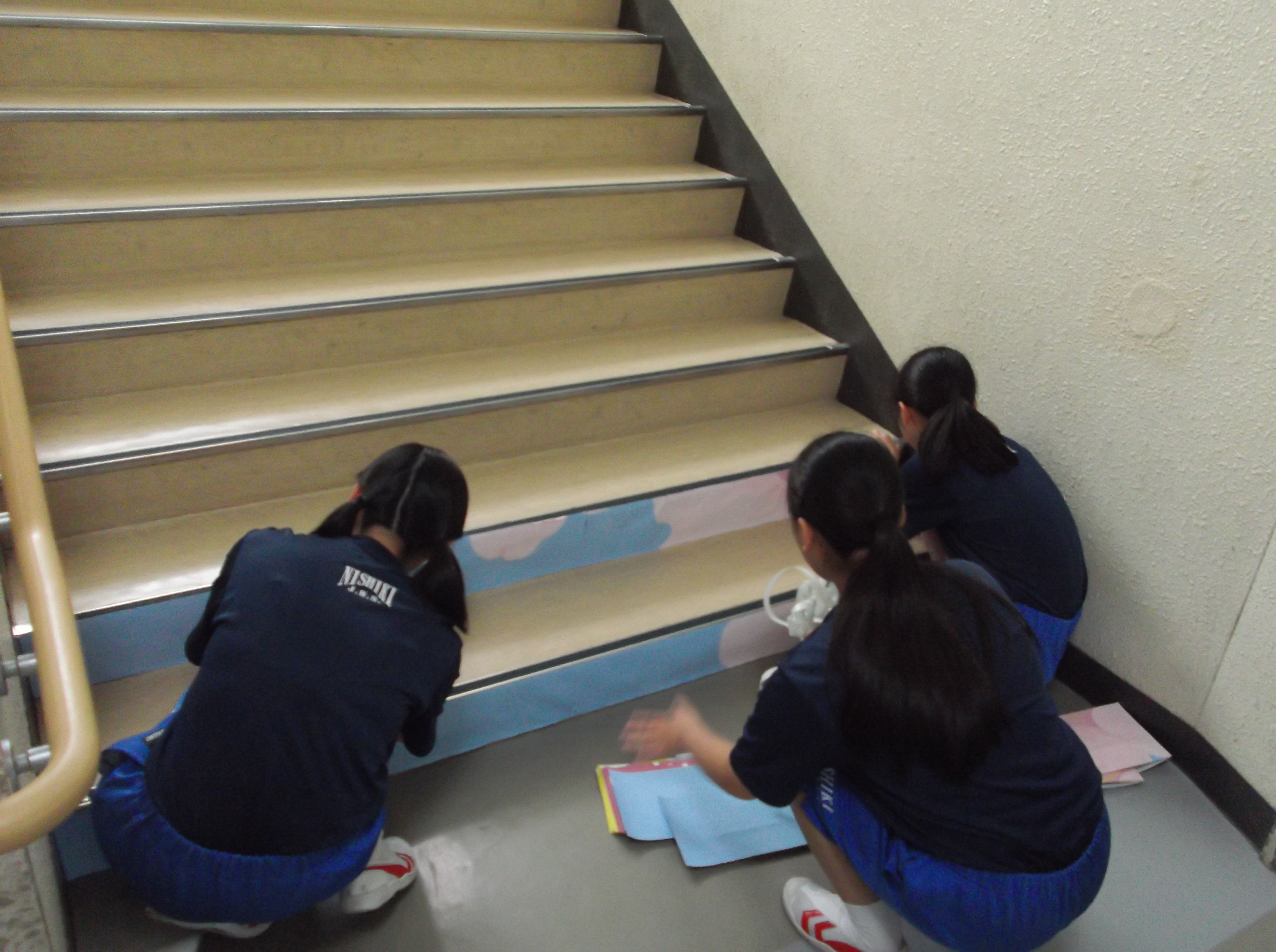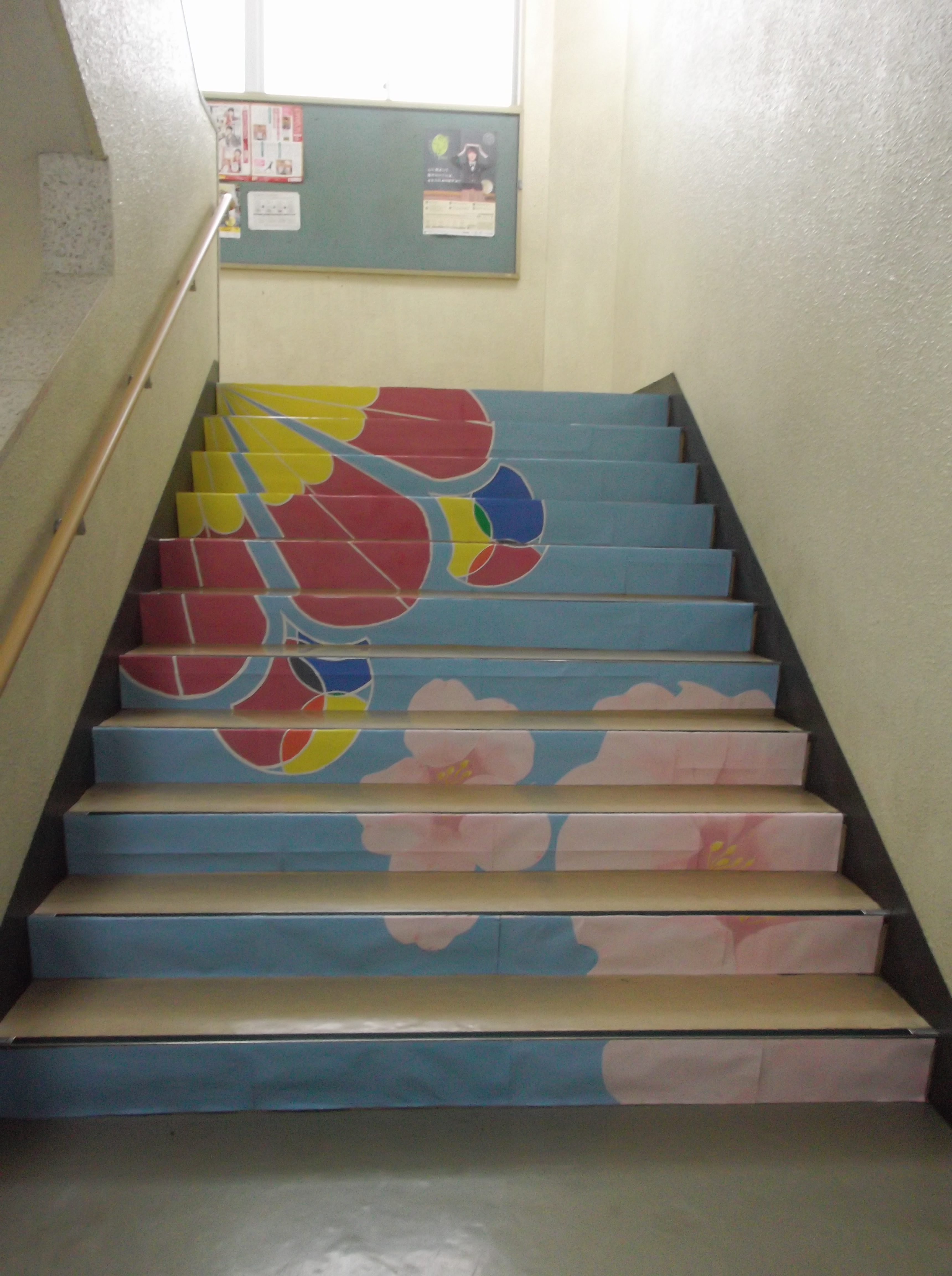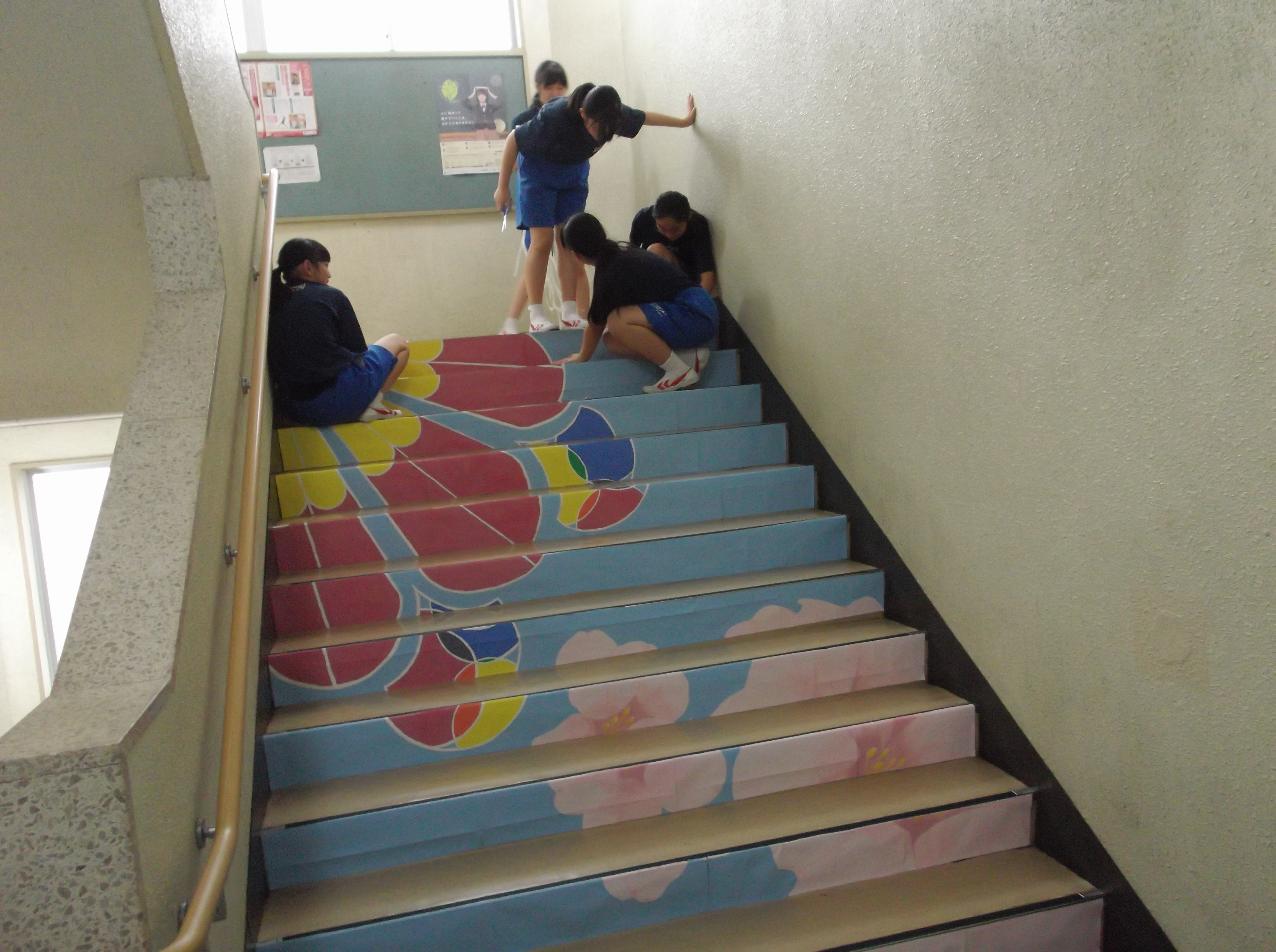 平成30年9月12日(水)、美術部員が、中央階段に階段アートを作成しています。桜の花のデザインを生かした作品になります。完成を楽しみにしていてください。改めて、東階段に設置してある階段アートを紹介します。