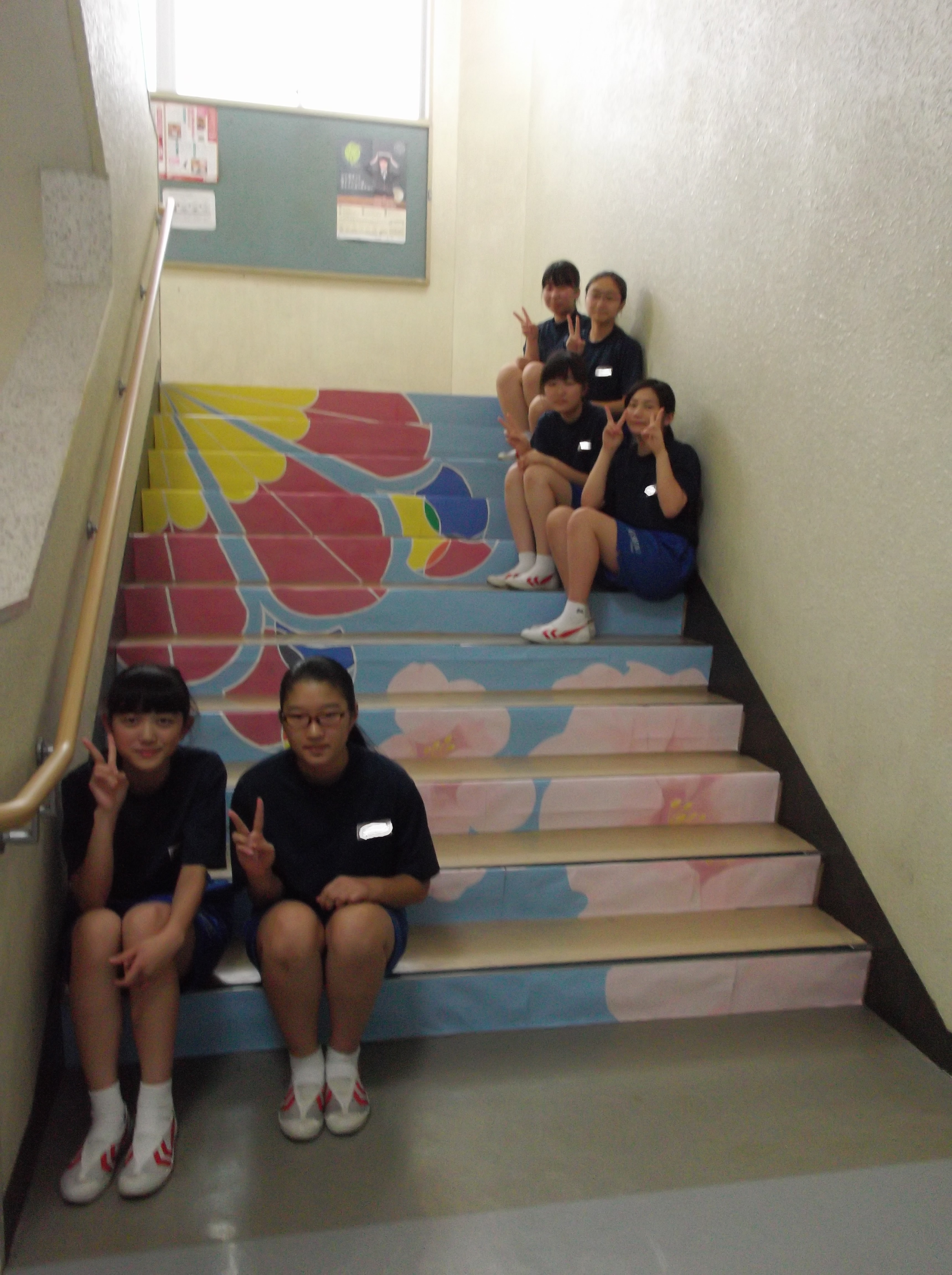 平成30年9月13日(木)、美術部の2年生が作成していた階段アートが完成しました。桜の花をモチーフにとても明るい作品に仕上がりました。今後、夏、秋、冬をテーマに作品を作成し、展示していきます。楽しみにしていてください。