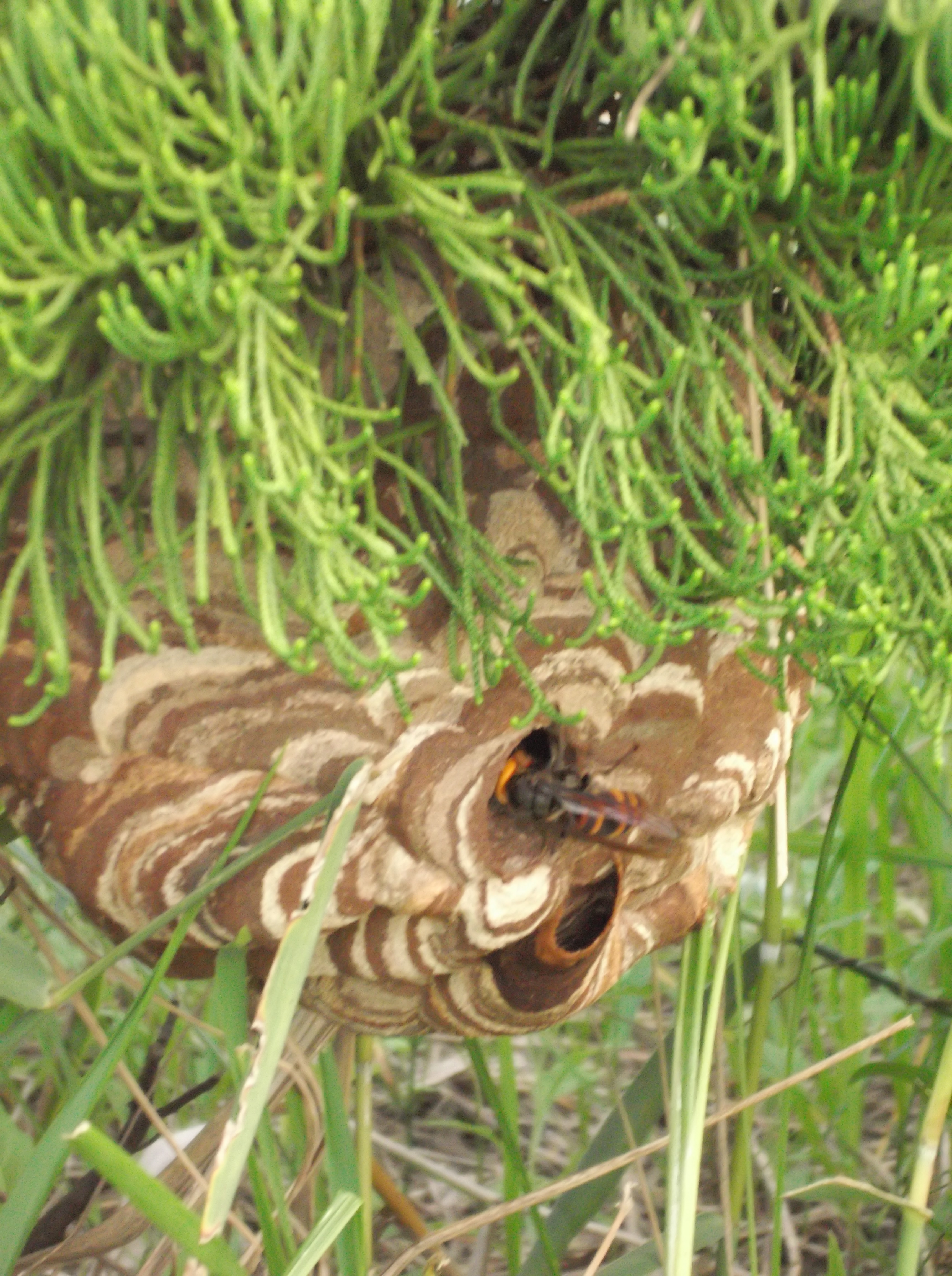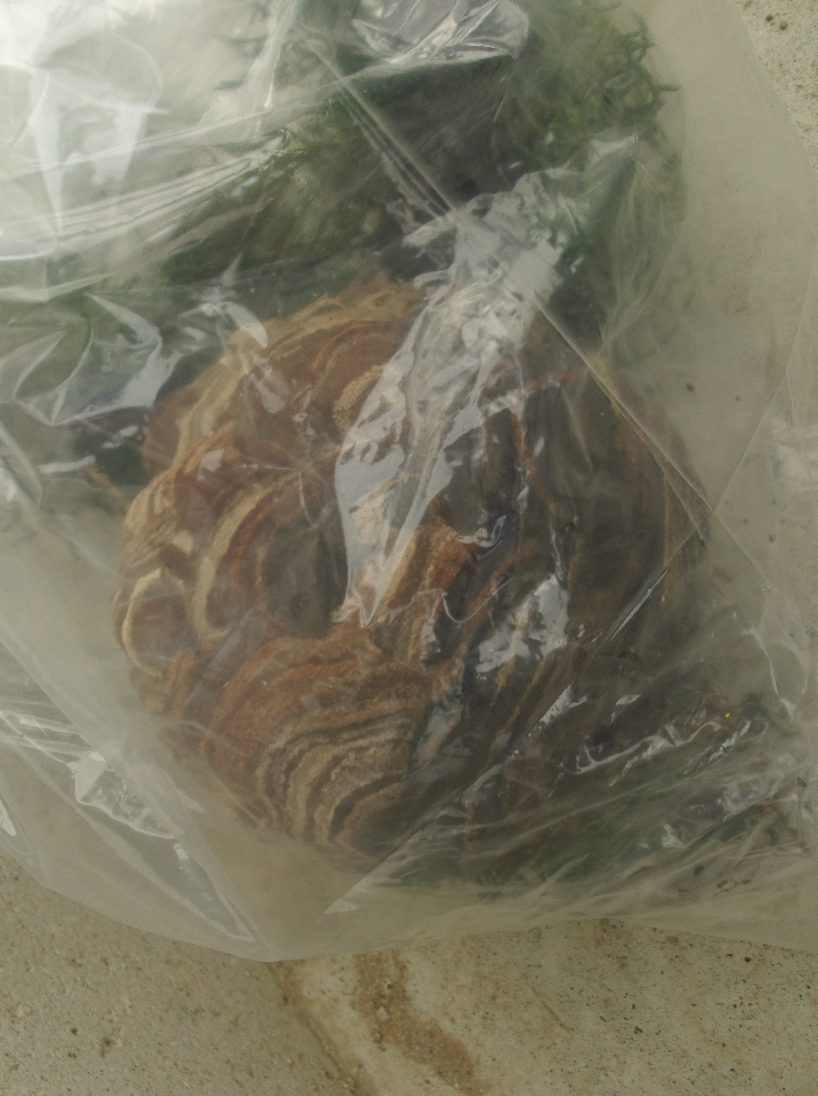 秋は、スズメバチが凶暴になる季節です。被害のニュースも聞かれます。本校でも、野球のグランドの1塁側、植木の下の方に、スズメバチが巣を作っているのを発見しました。本日、平成30年9月19日(水)の早朝に、巣を除去しました。直径20㎝ほどになっていました。