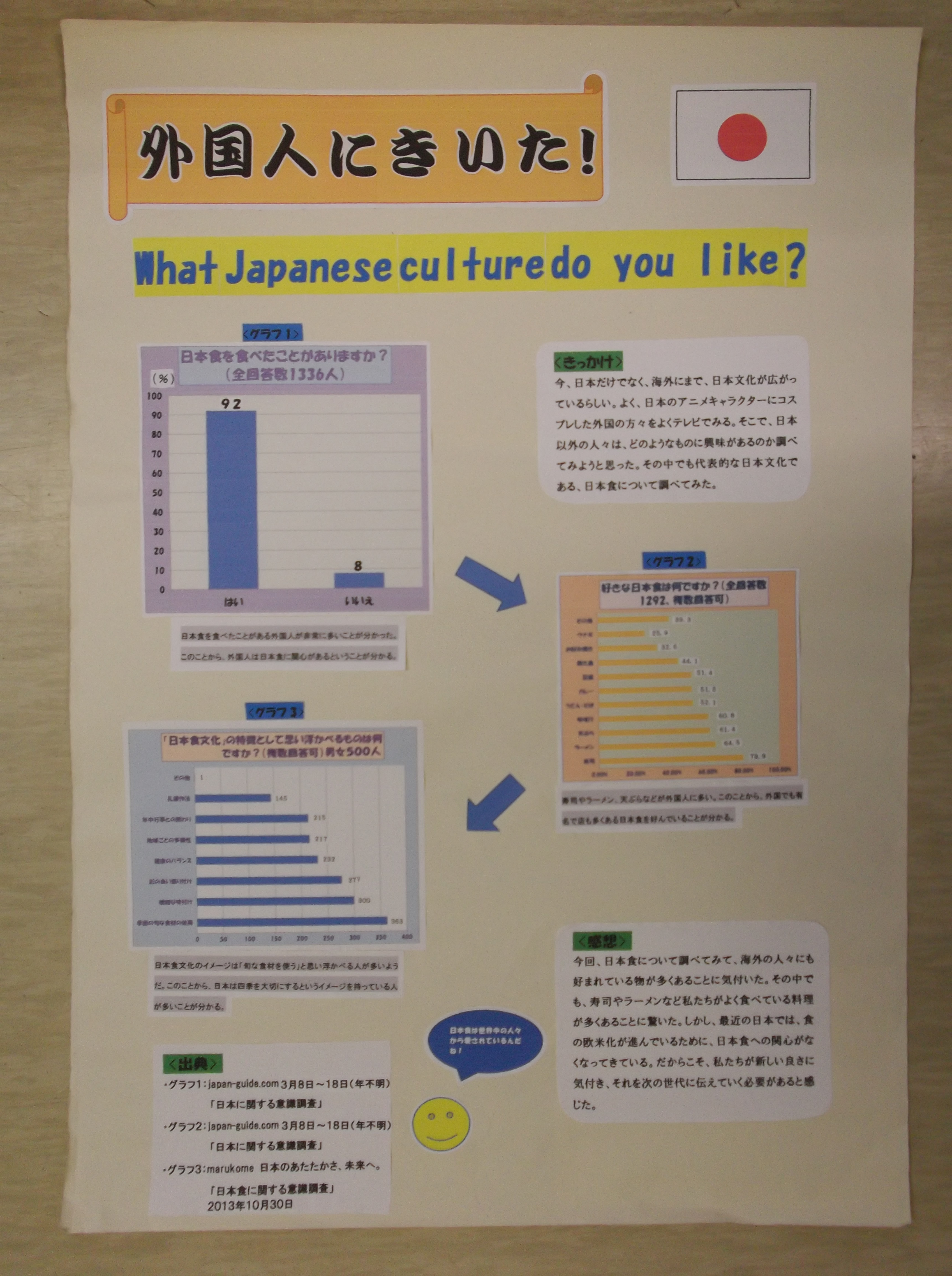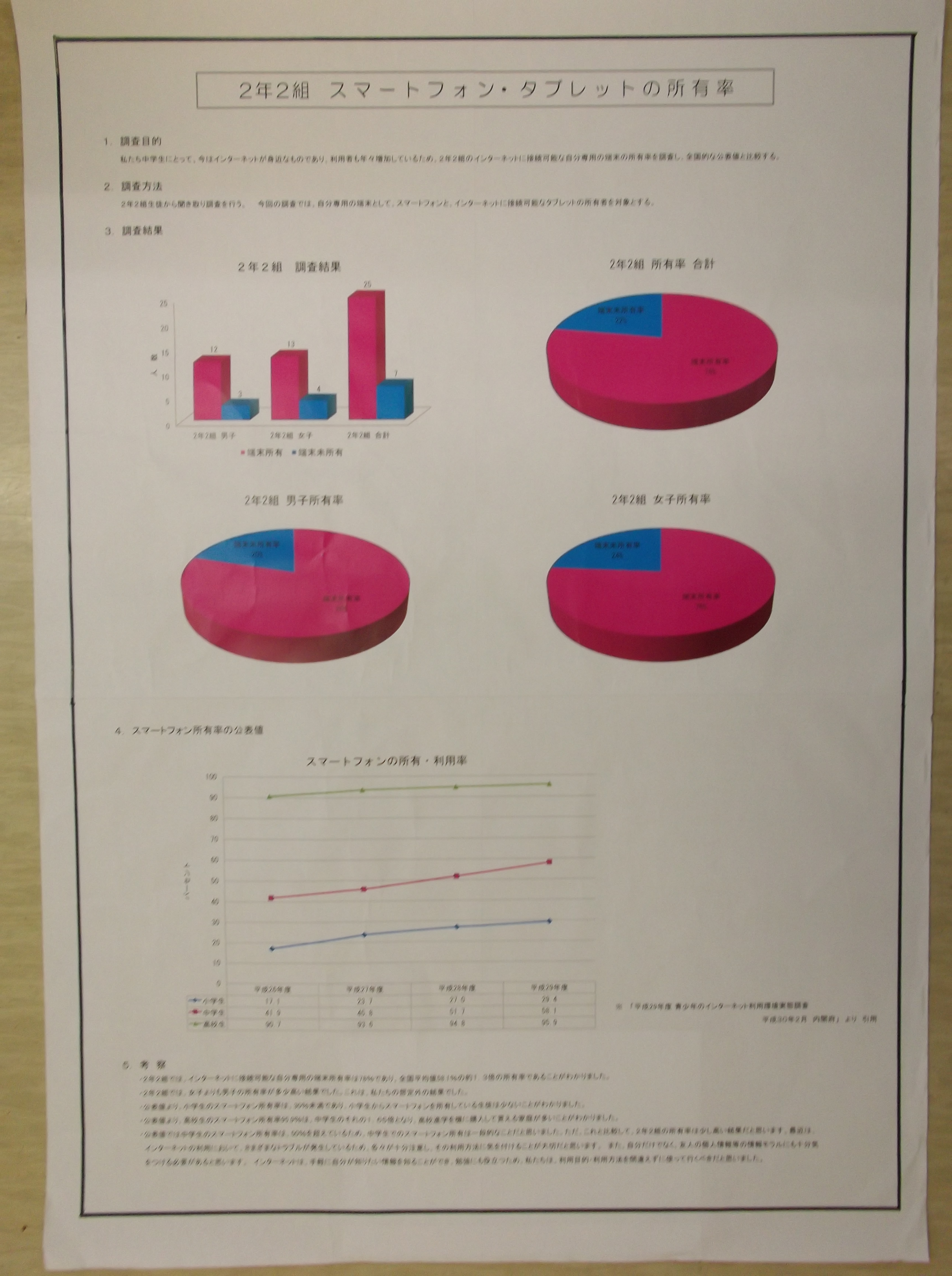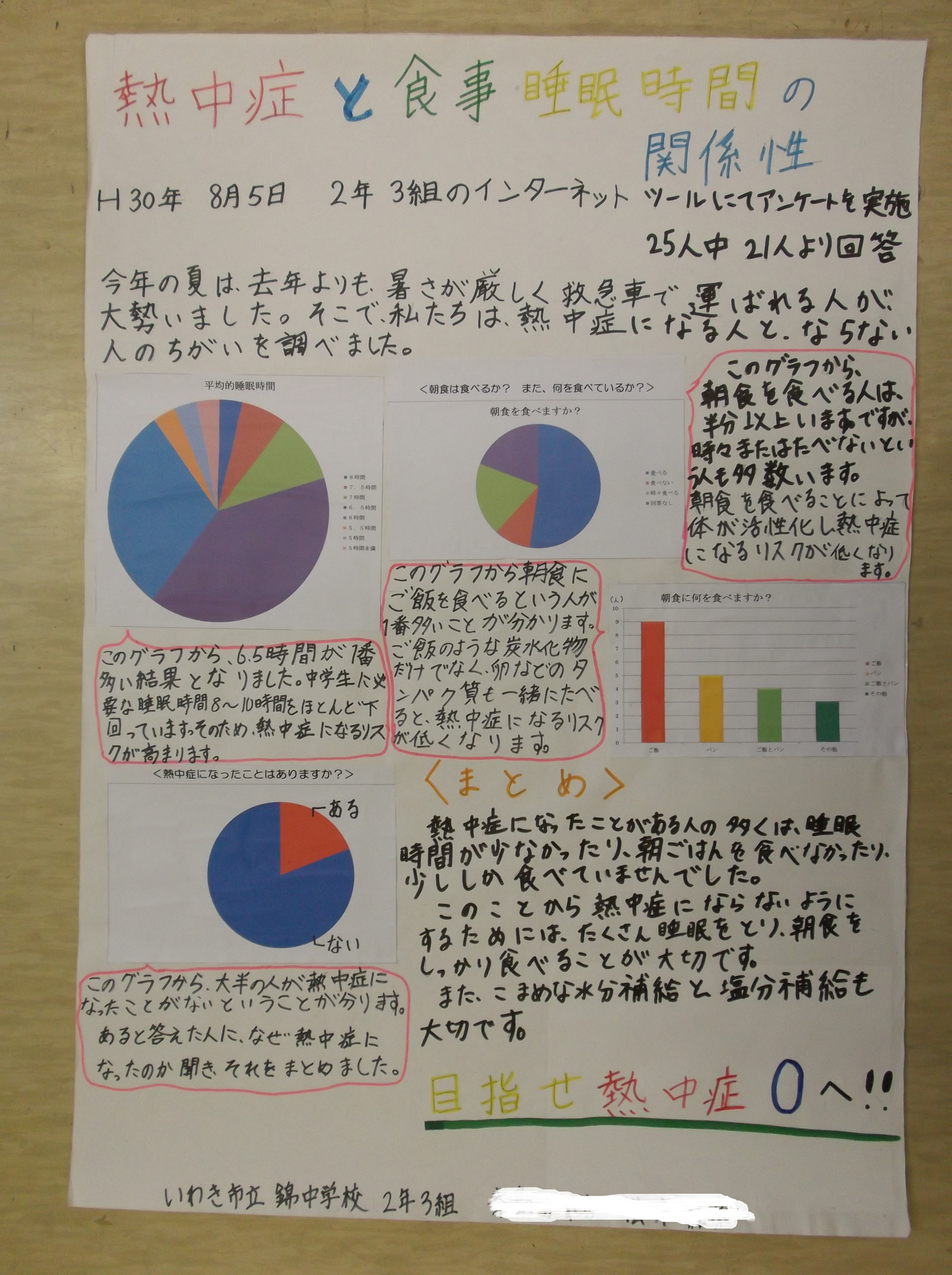 「熱中症と食事・睡眠時間の関係性」、「熱中症対策」「私の未来の働き方」、「スマートフォン・タブレットの所持率」「あなたはおかしは好きですか?」「外国人に聞いた日本の好きなところ」といった、現在社会で話題になっているものや各自が興味を持ったテーマについてまとめていました。