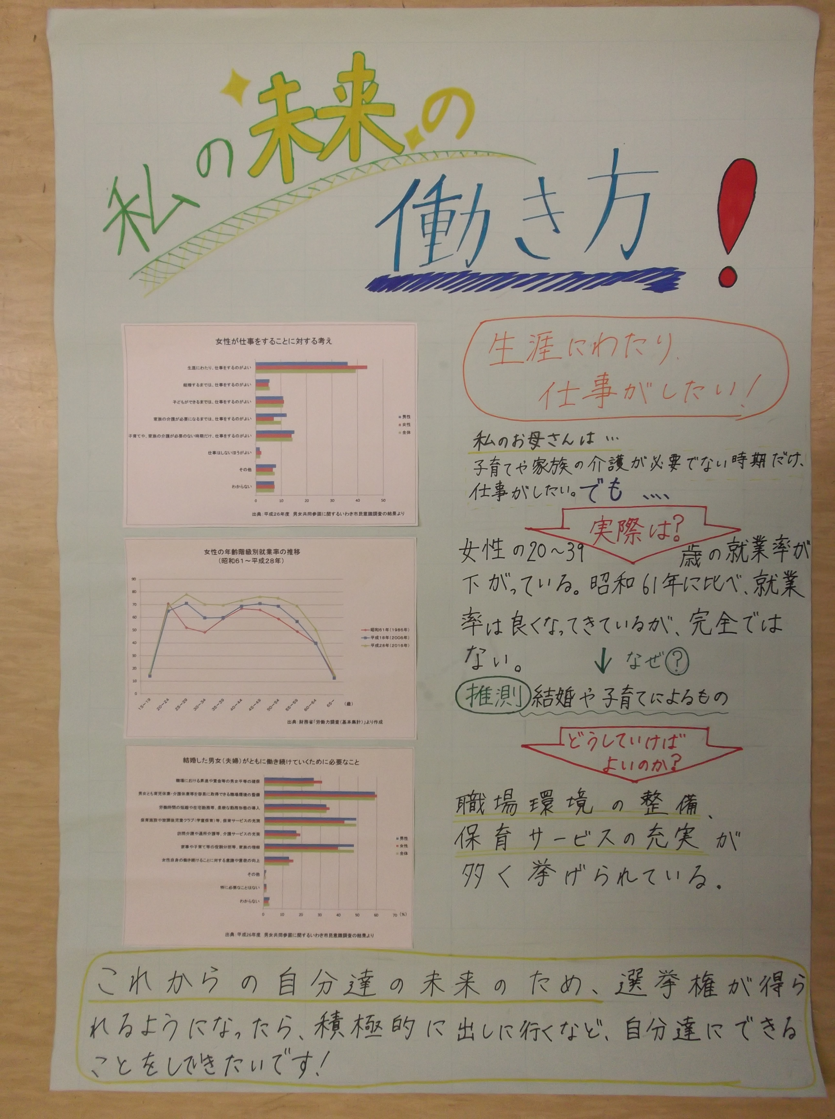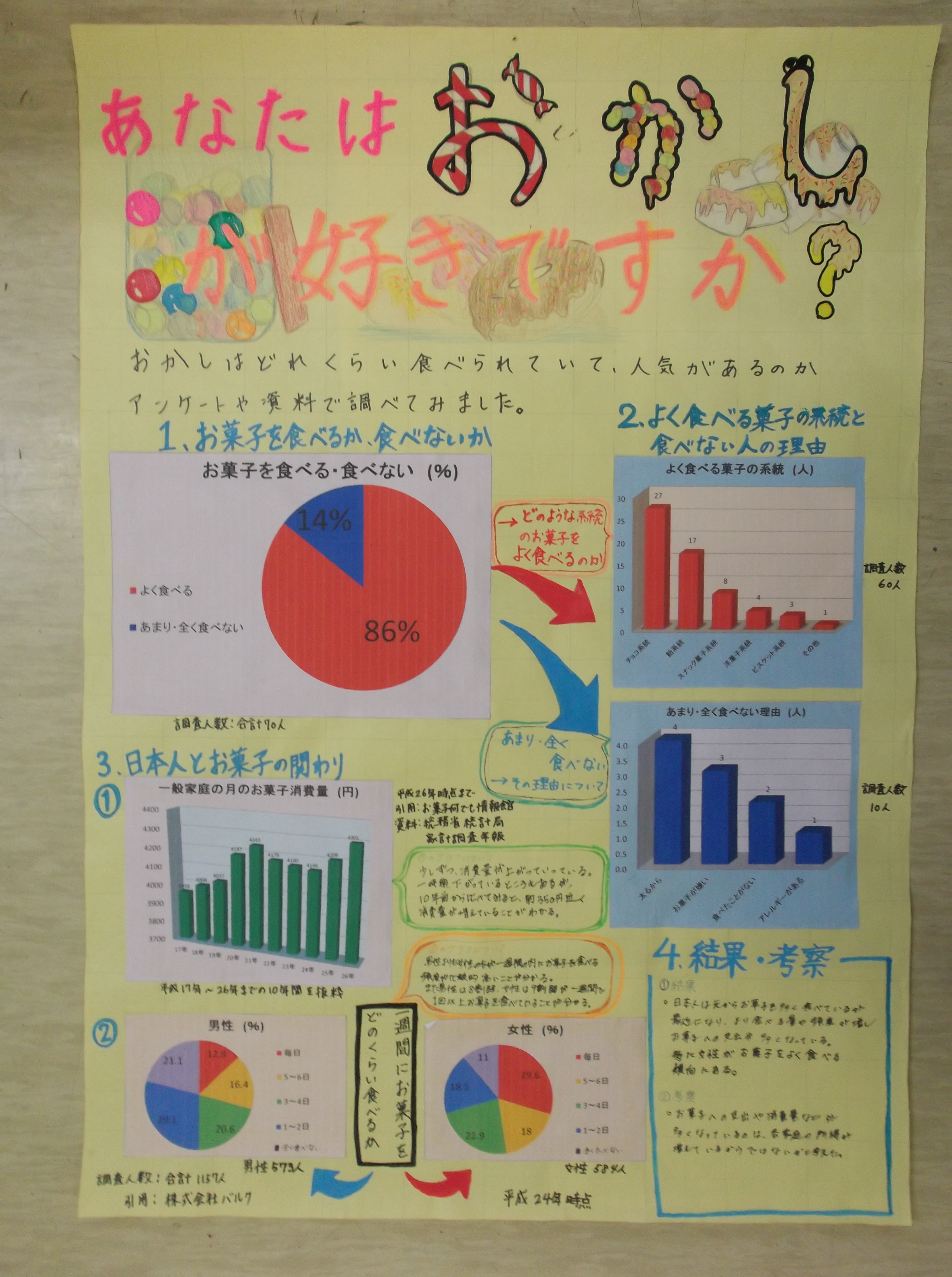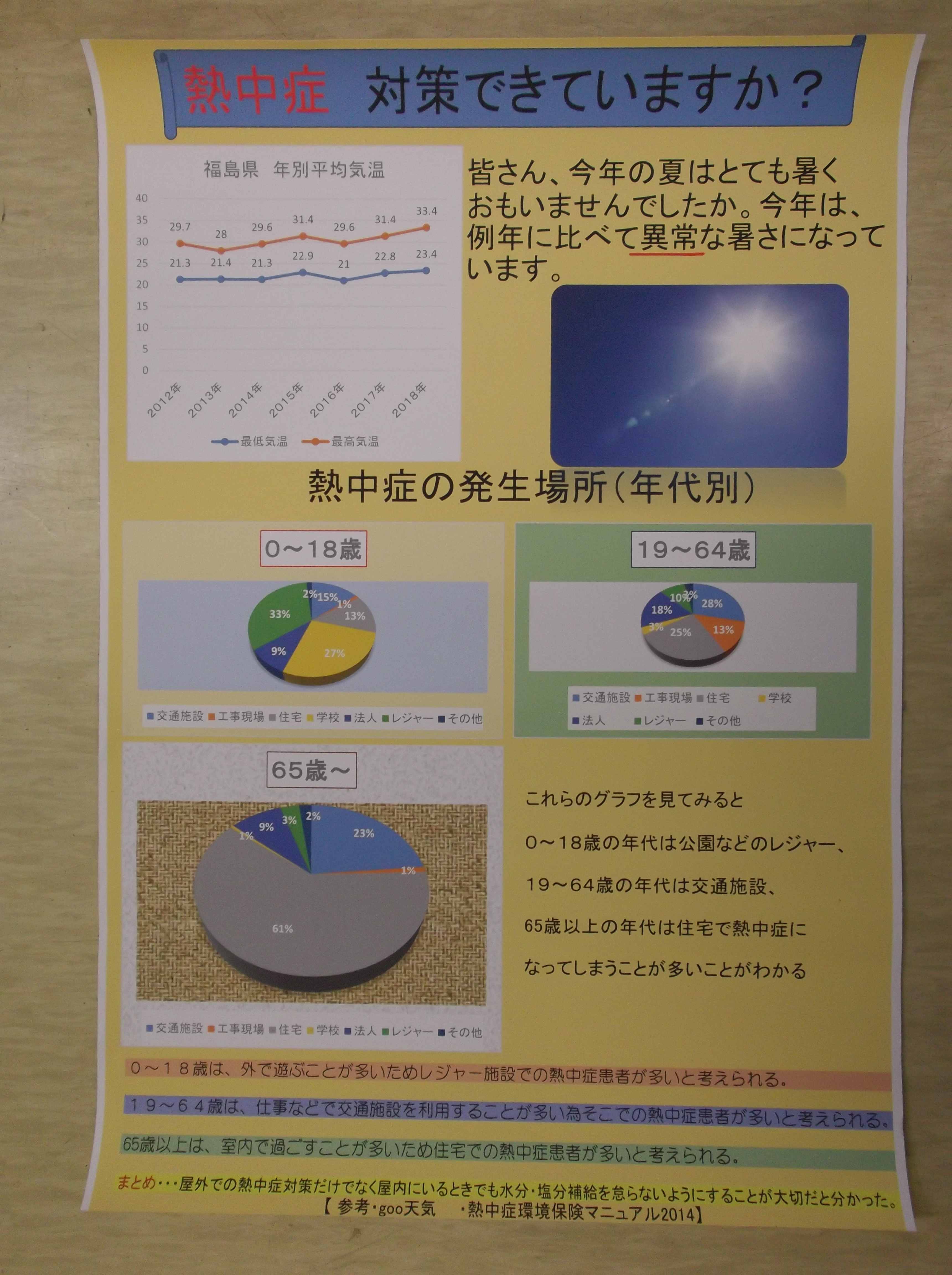 「熱中症と食事・睡眠時間の関係性」、「熱中症対策」「私の未来の働き方」、「スマートフォン・タブレットの所持率」「あなたはおかしは好きですか?」「外国人に聞いた日本の好きなところ」といった、現在社会で話題になっているものや各自が興味を持ったテーマについてまとめていました。