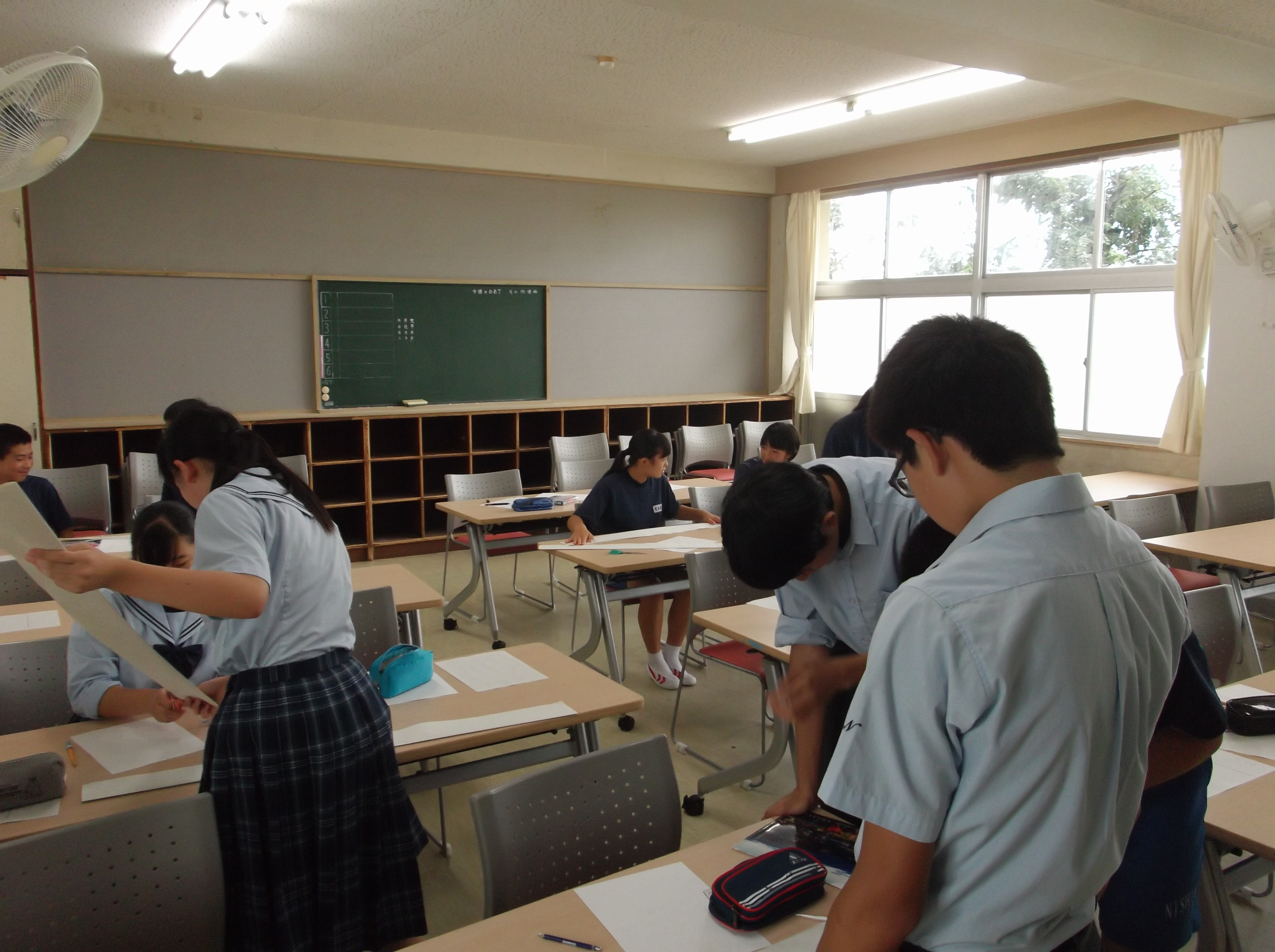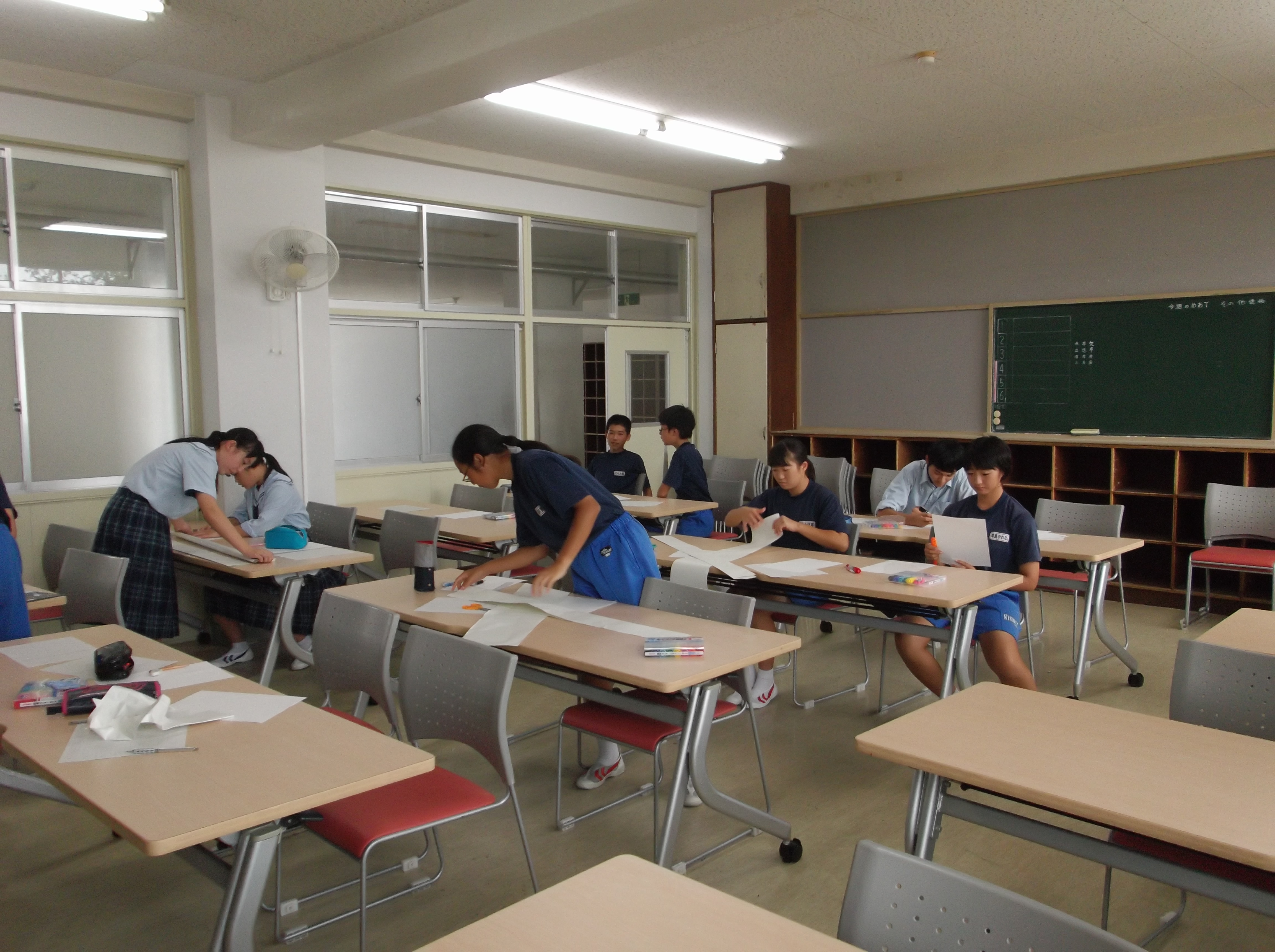 次の写真は、生徒会選挙に向けて、放課後の時間を使って、立候補者と責任者が選挙の準備している様子です。選挙グッズの作成をしていました。
