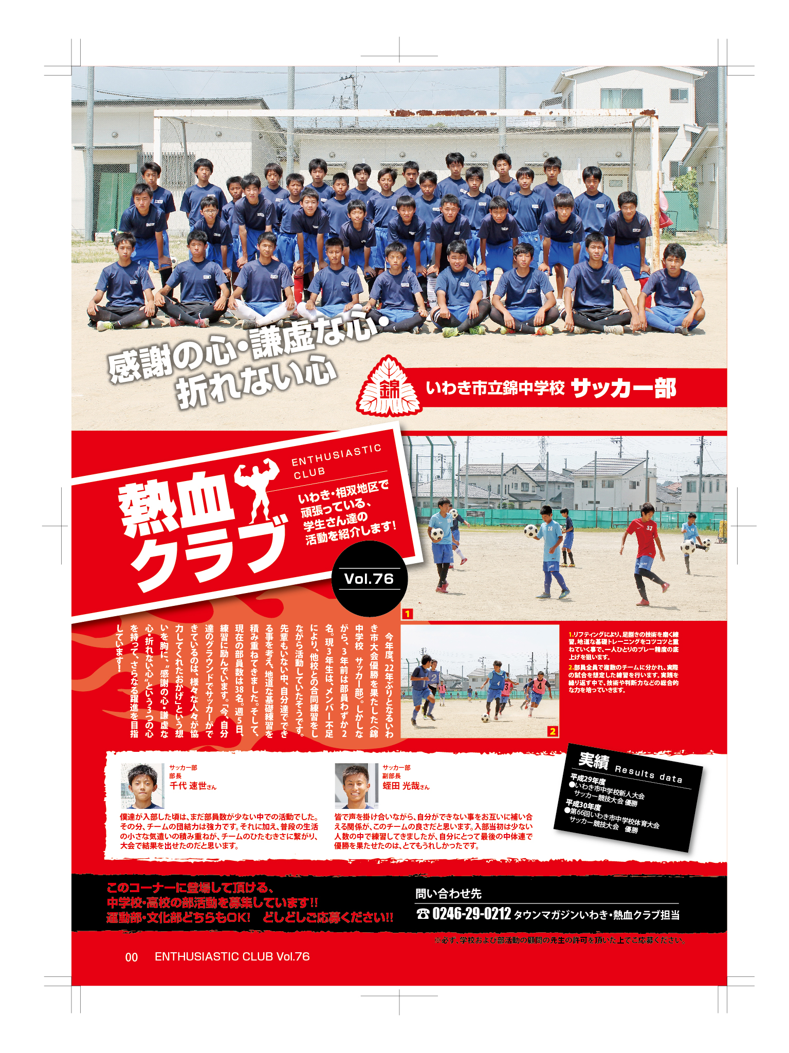 『今年度、22年ぶりとなるいわき市大会優勝を果たしたサッカー部、…(途中省略)…「今、自分たちのグランドでサッカーができているのは、様々な人々が協力してくれたおかげ」という想いを胸に、〝感謝の心・謙虚な心・折れない心〟という3つの心を持って、さらなる躍進を目指しています!』