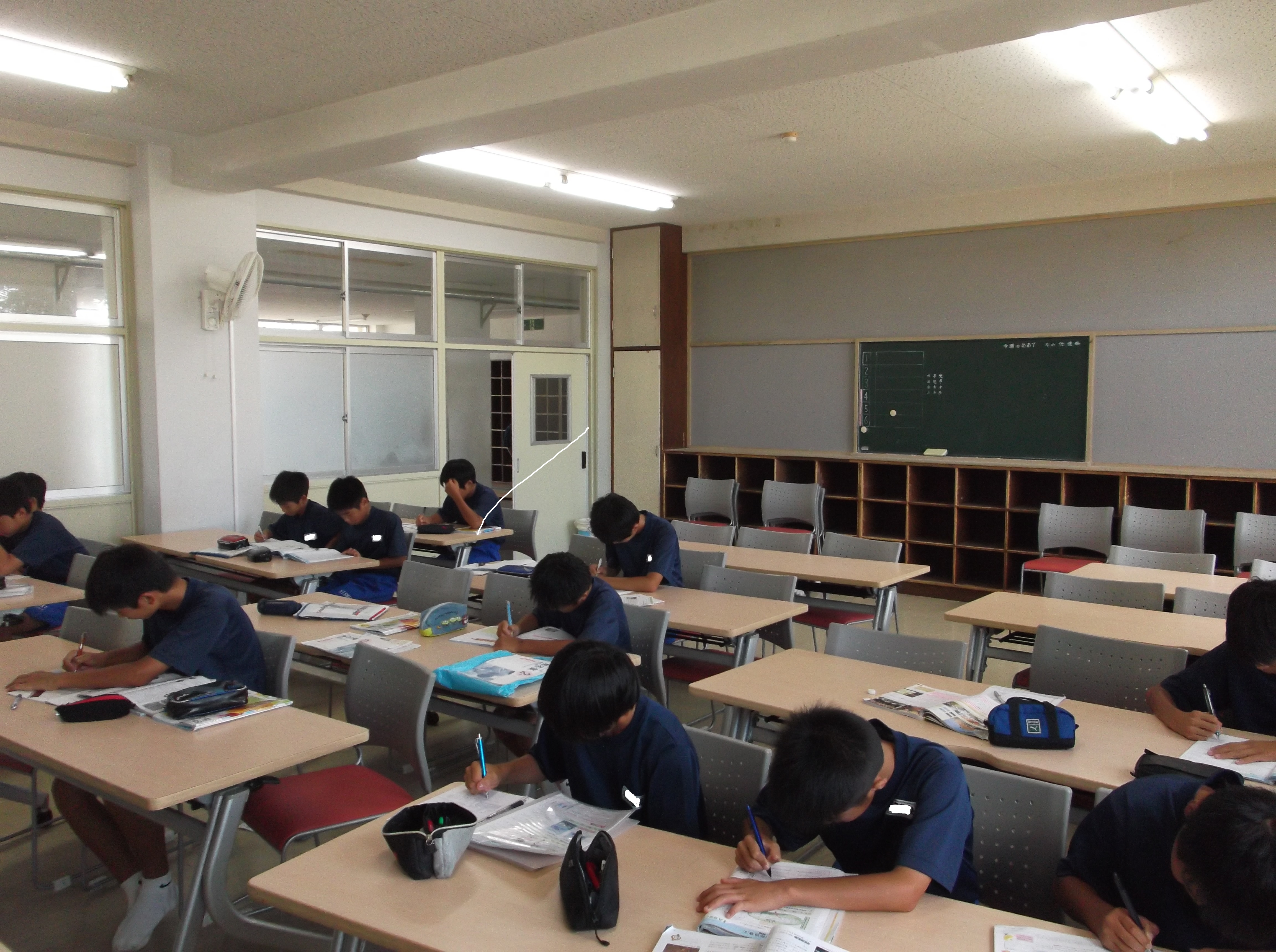 本日で、37日間の夏季休業の21日目となります。部活動では、練習だけでなく、練習前の自主学習や夏休みの課題の確認なども行っています。次の写真は、朝の自主学習の様子です。計画的な取り組みを期待しています。