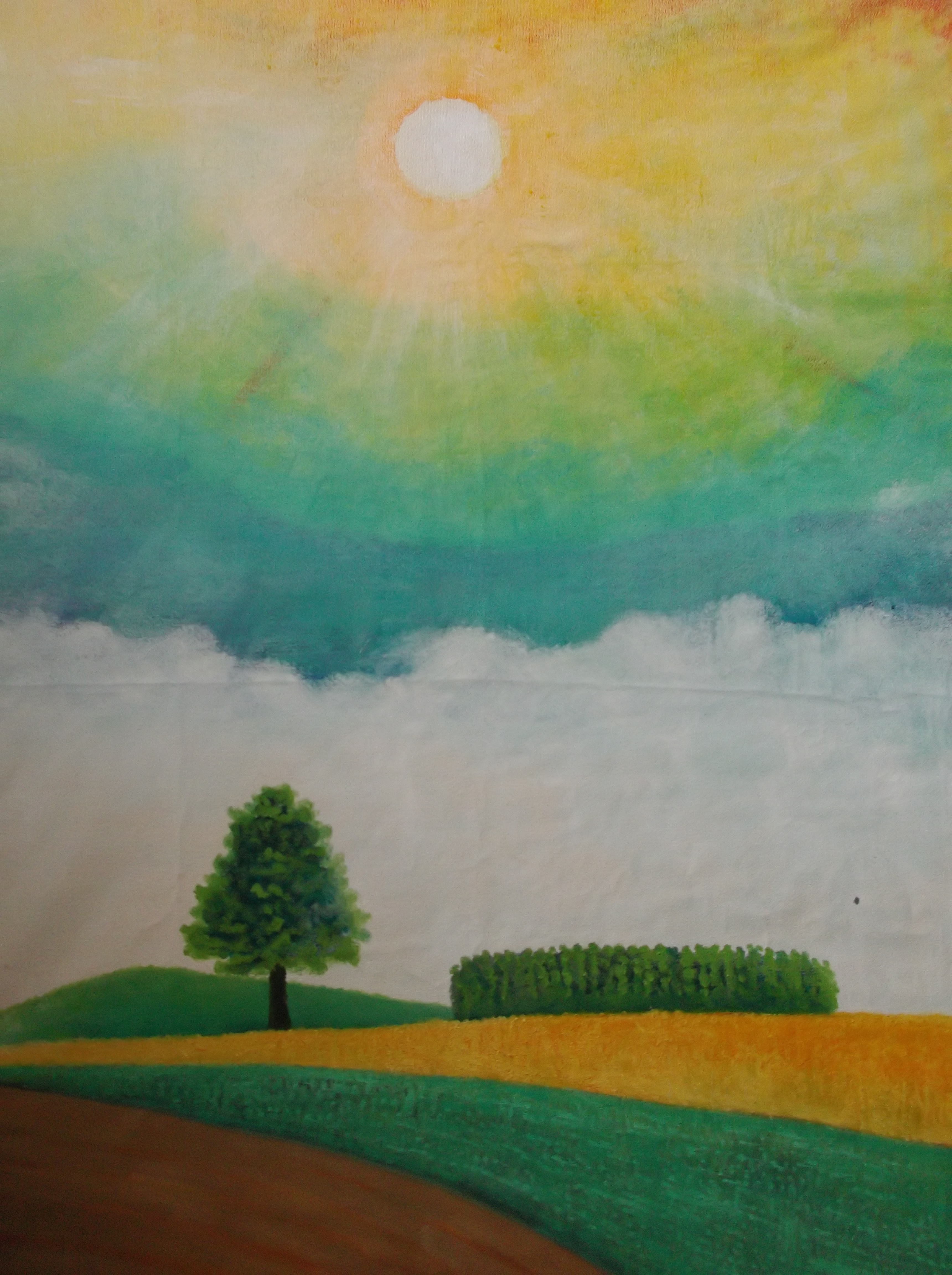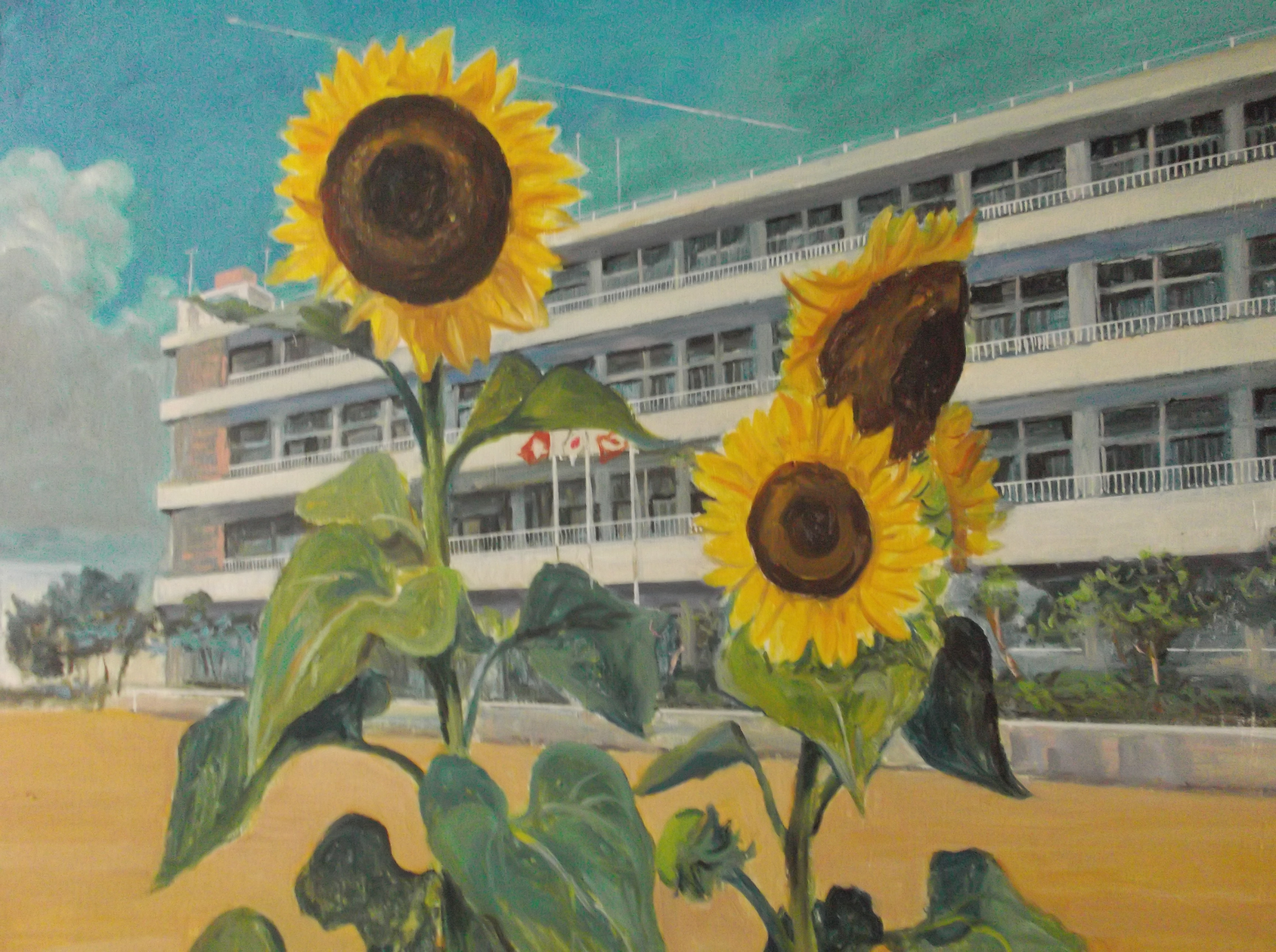 さて、錦中には、校舎内に数多くの絵が掲示してあります。ご紹介します。1枚は、夏にふさわしい作品です。ひまわりを手前に大きく、そして、遠近を意識して錦中校舎を描いています。もう1枚は、太陽のエネルギーと大地の広がりが感じられる作品です。ご来校の際は、ご覧ください。