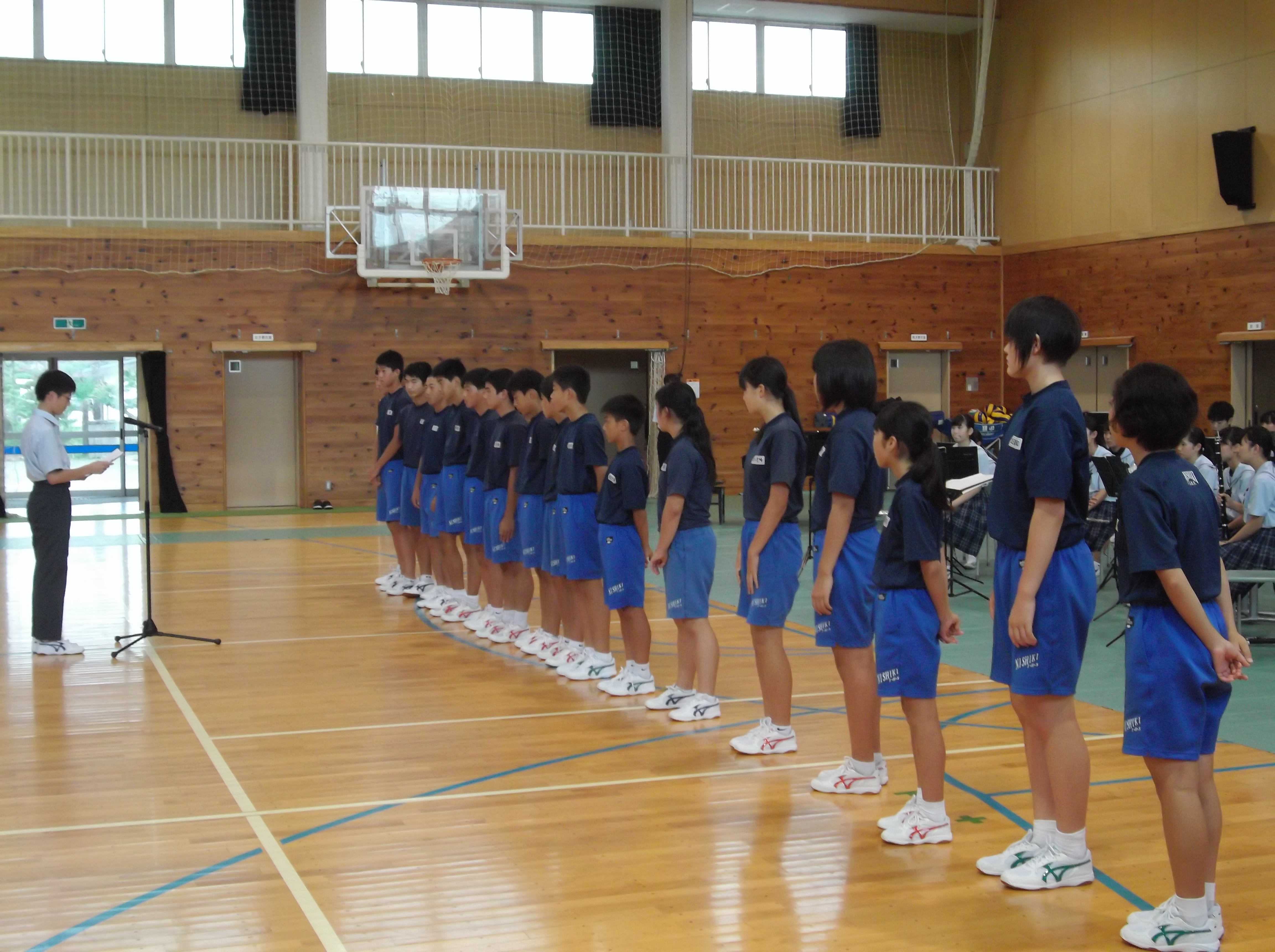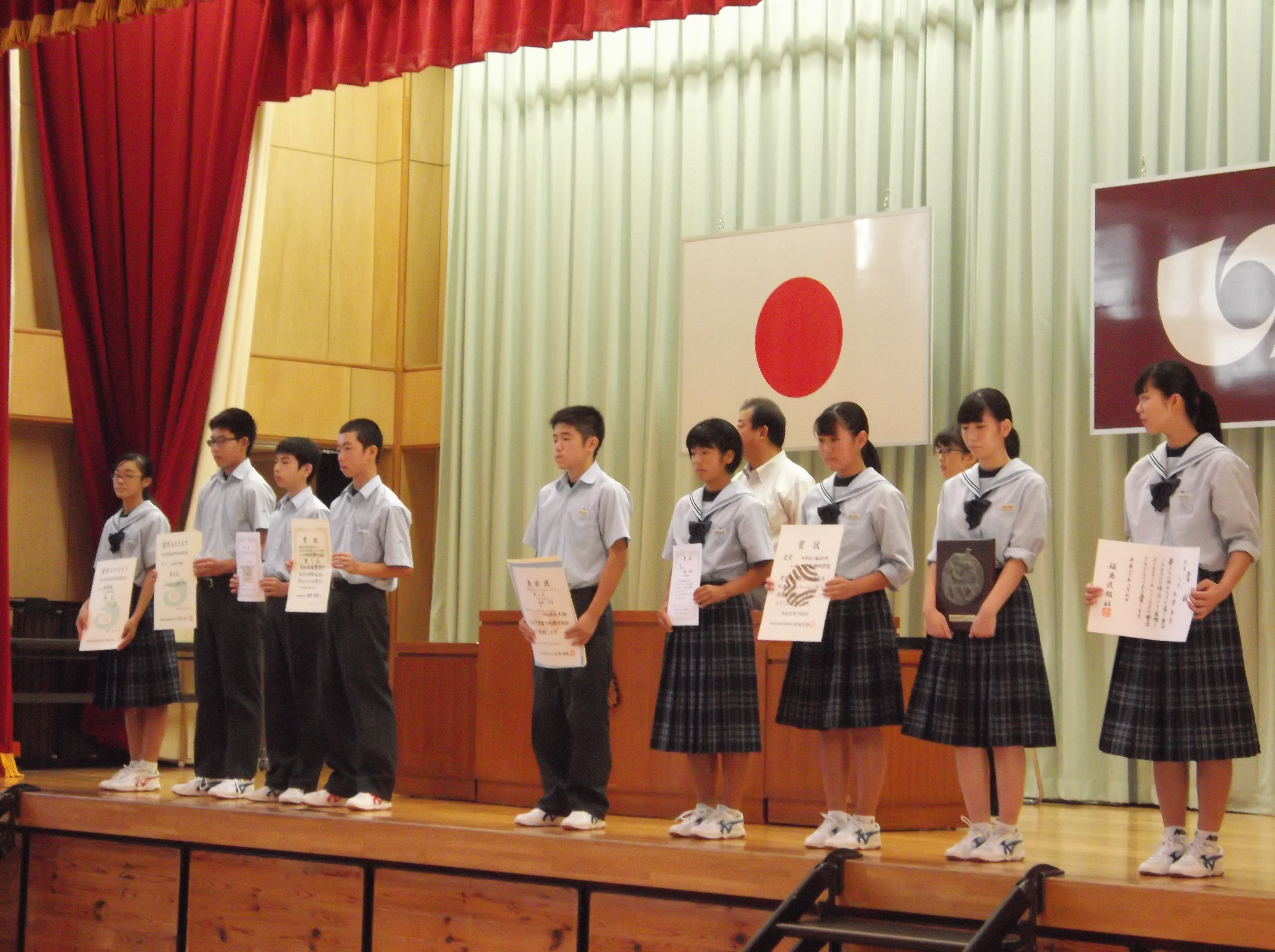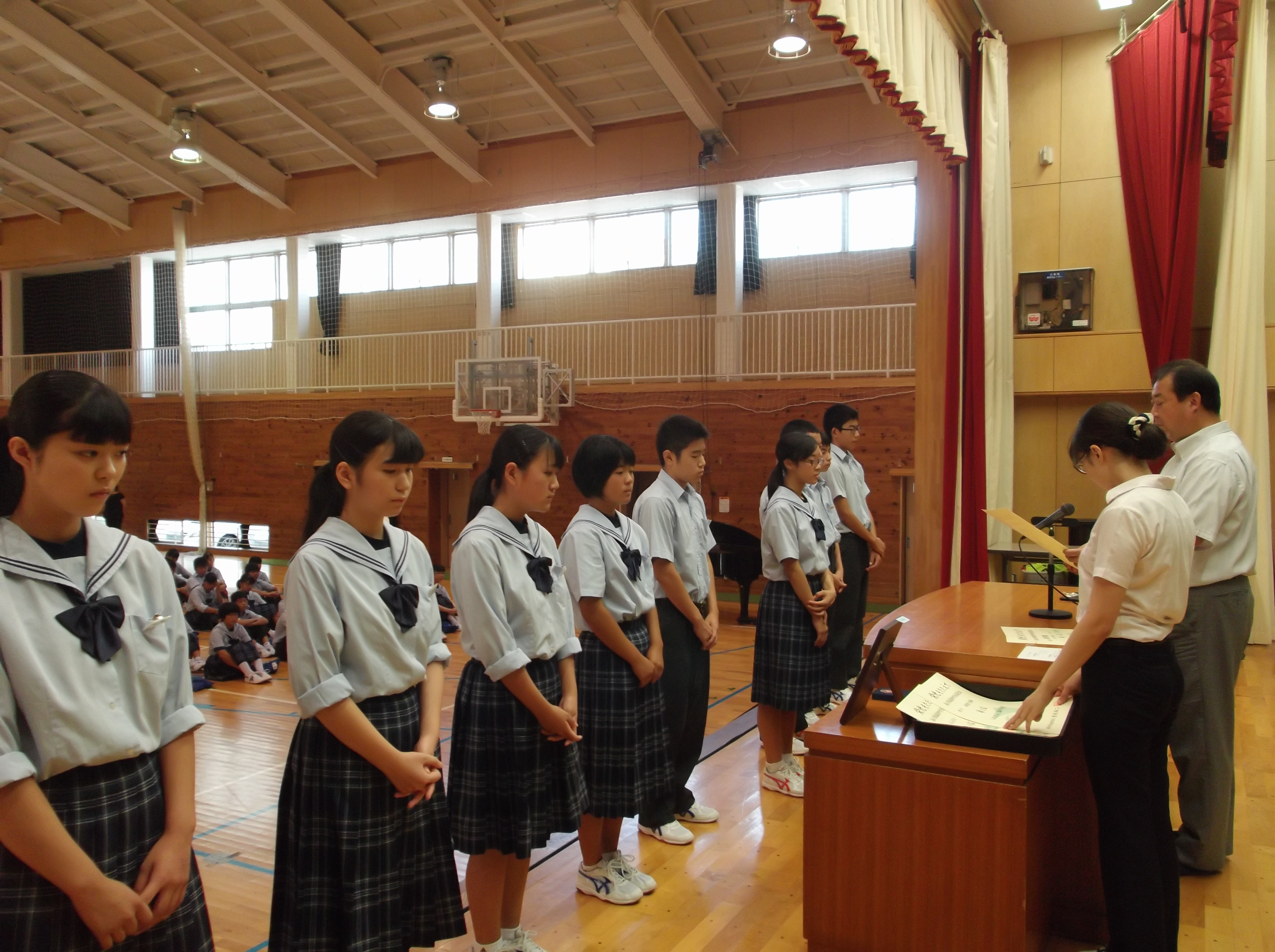 式に先立ち、夏季休業中の部活動の表彰をしました。福島県中学校体育大会(中体連県大会)での卓球、水泳、新体操での入賞、吹奏楽コンクール県大会金賞、ソフトテニス選手権大会や卓球選手権、剣道錬成大会、福島県たなばた展など、数多くの活躍が見られました。