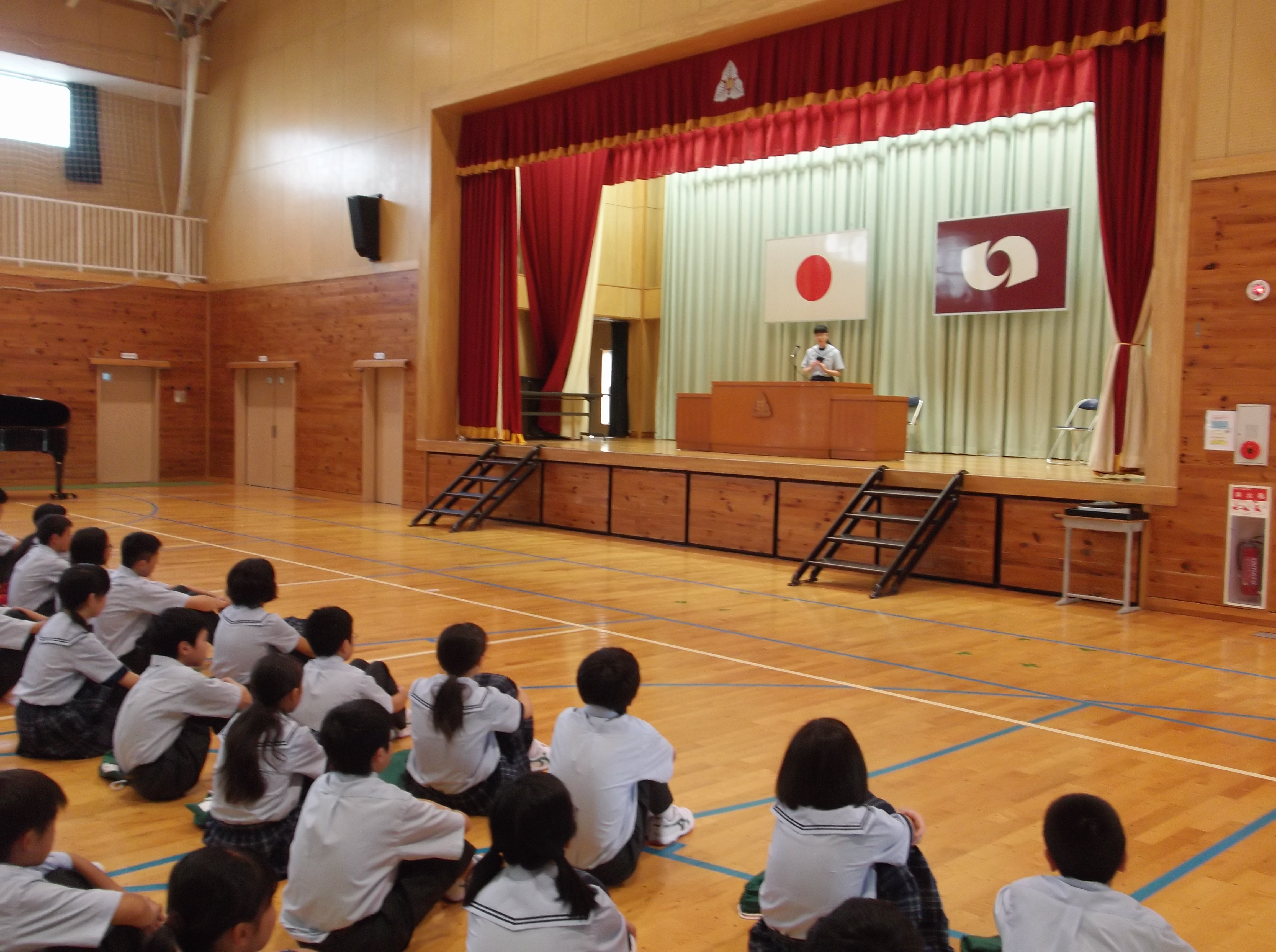 式の終了後、市中学校英語弁論大会に出場する生徒が発表披露、生徒指導主事から、2学期の生活についての話がありました。