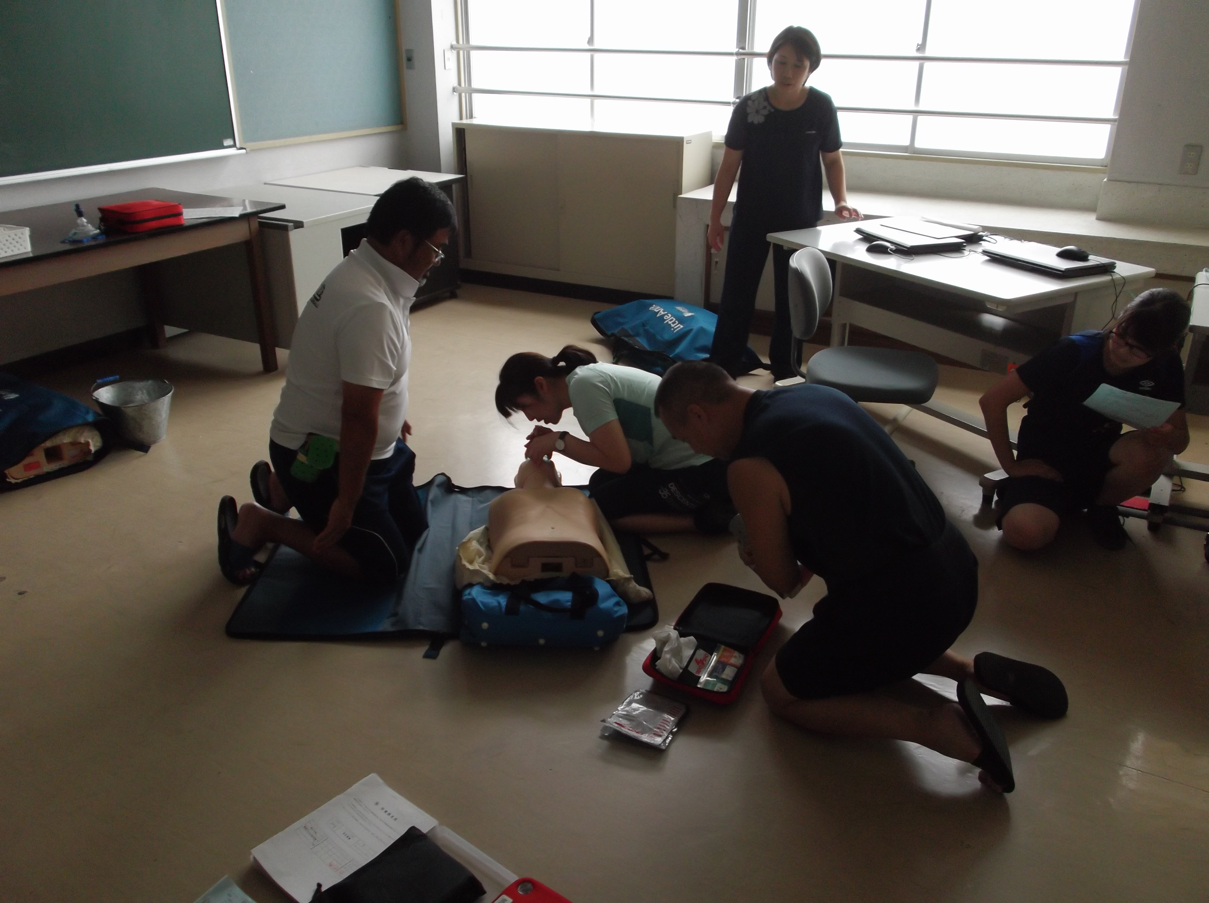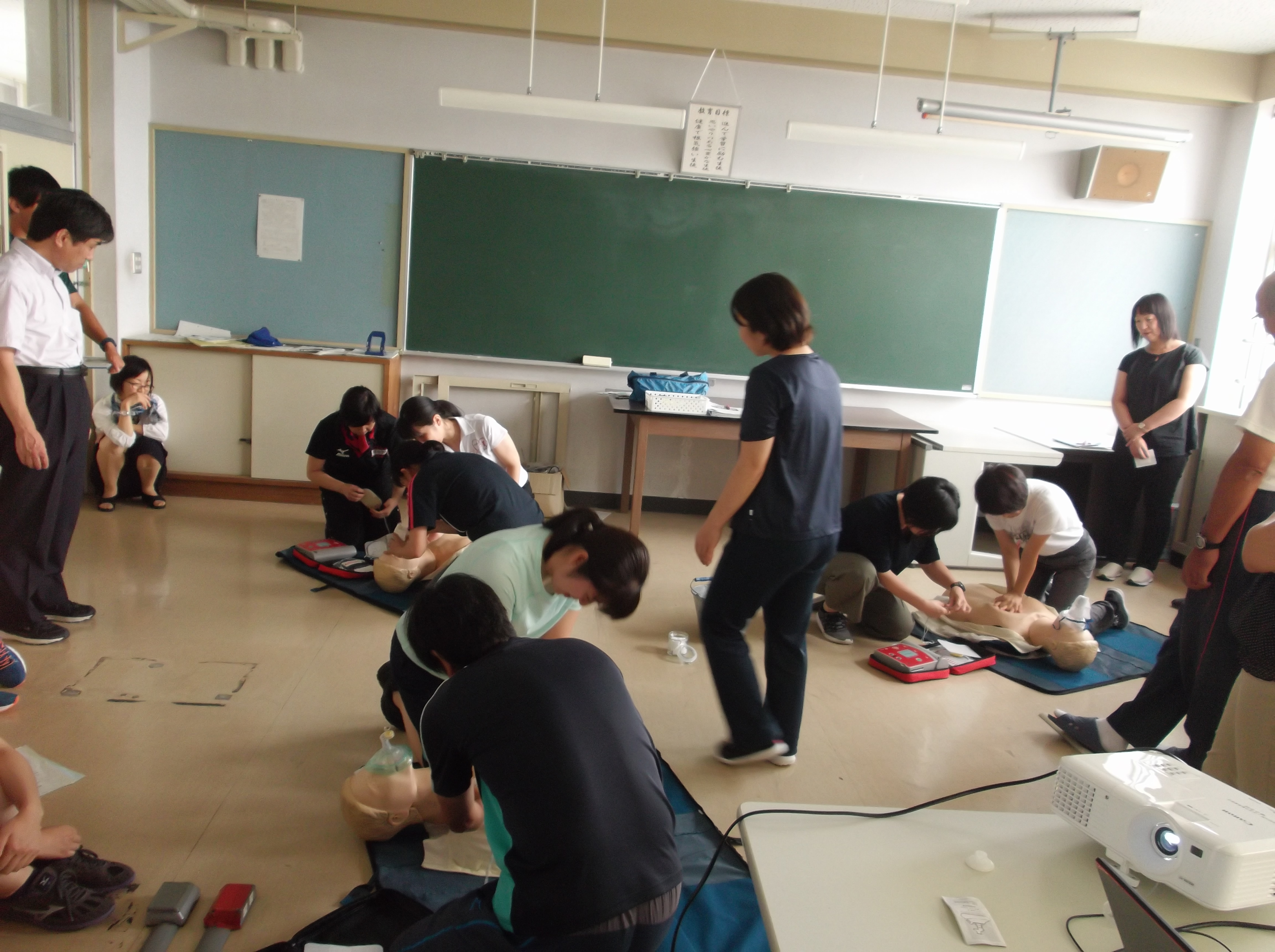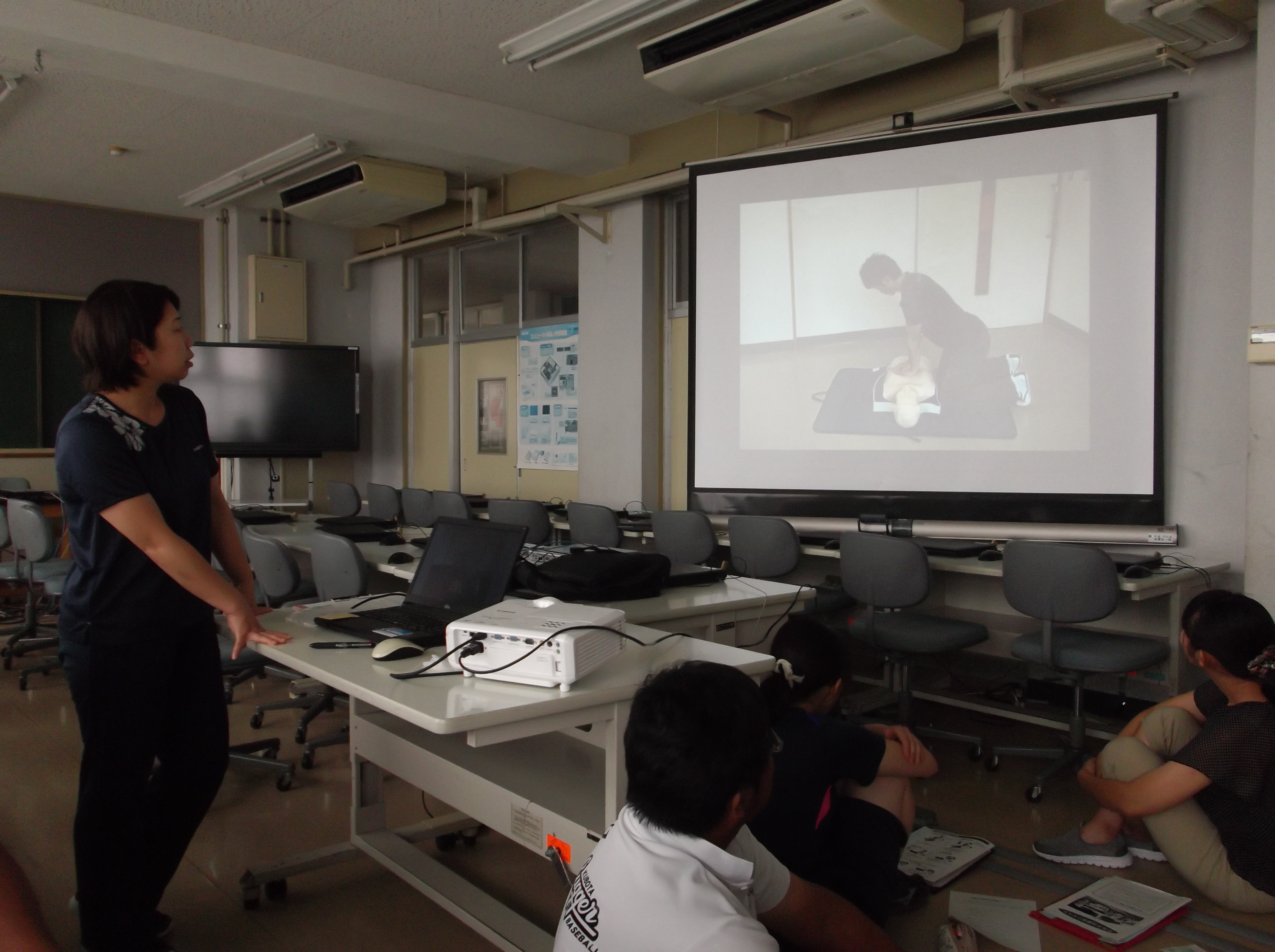 平成30年8月27日(月)14時から、応急手当講習として、心肺蘇生法とAEDの使い方について研修を行いました。講師は、応急手当普及員の資格を持つ本校の養護教諭が務め、市消防本部の講習で使用している資料やDVDを活用しました。