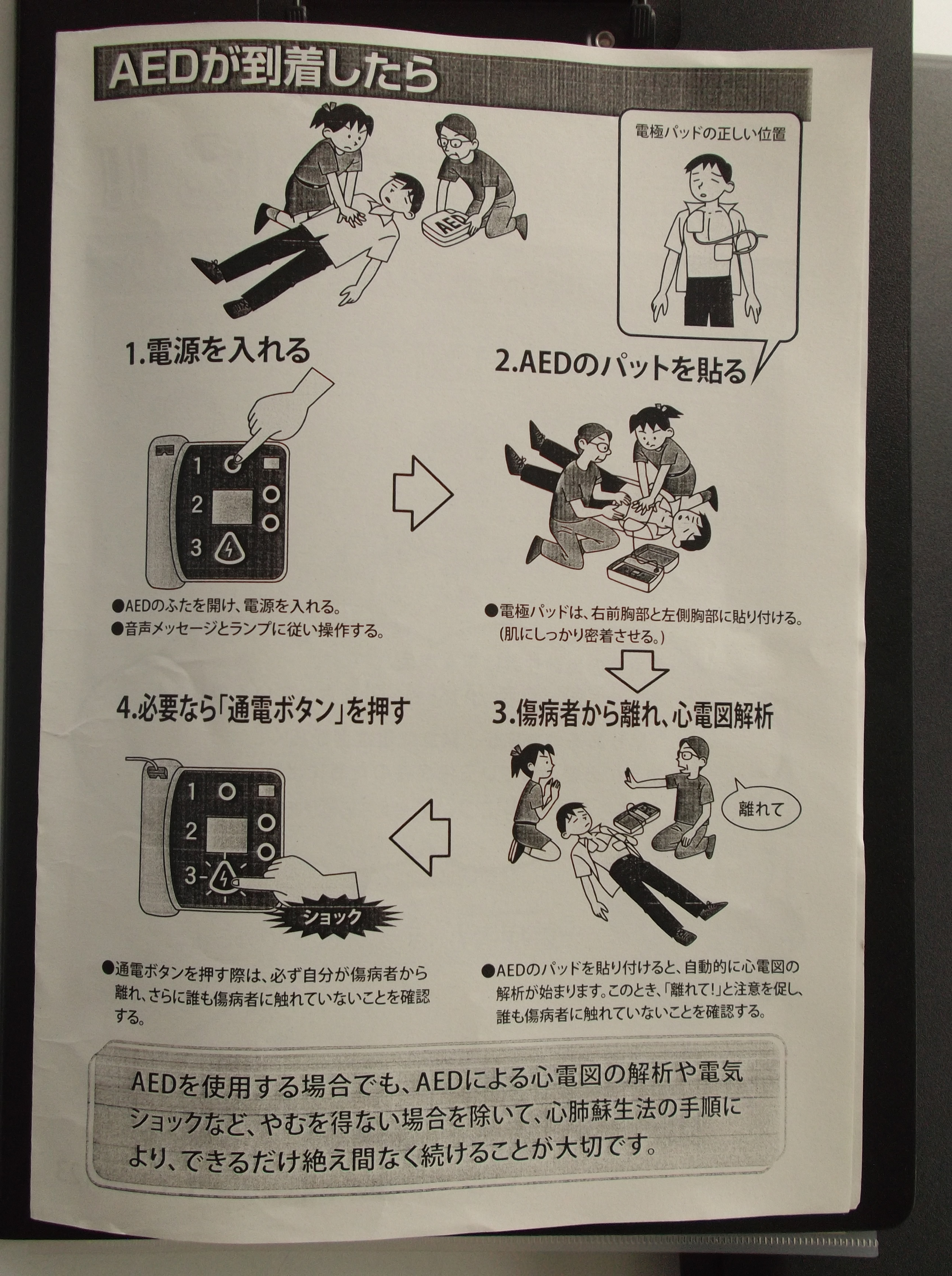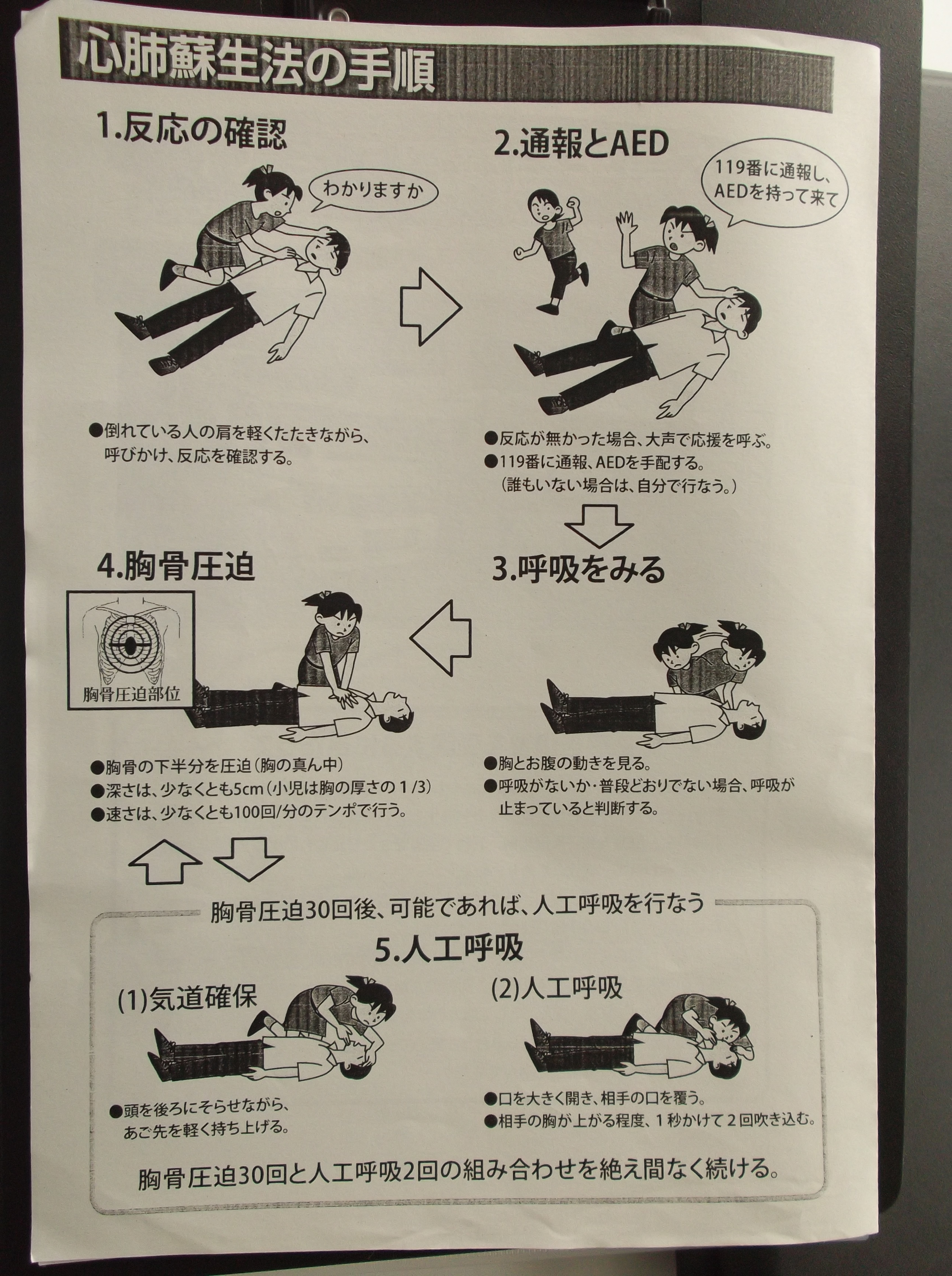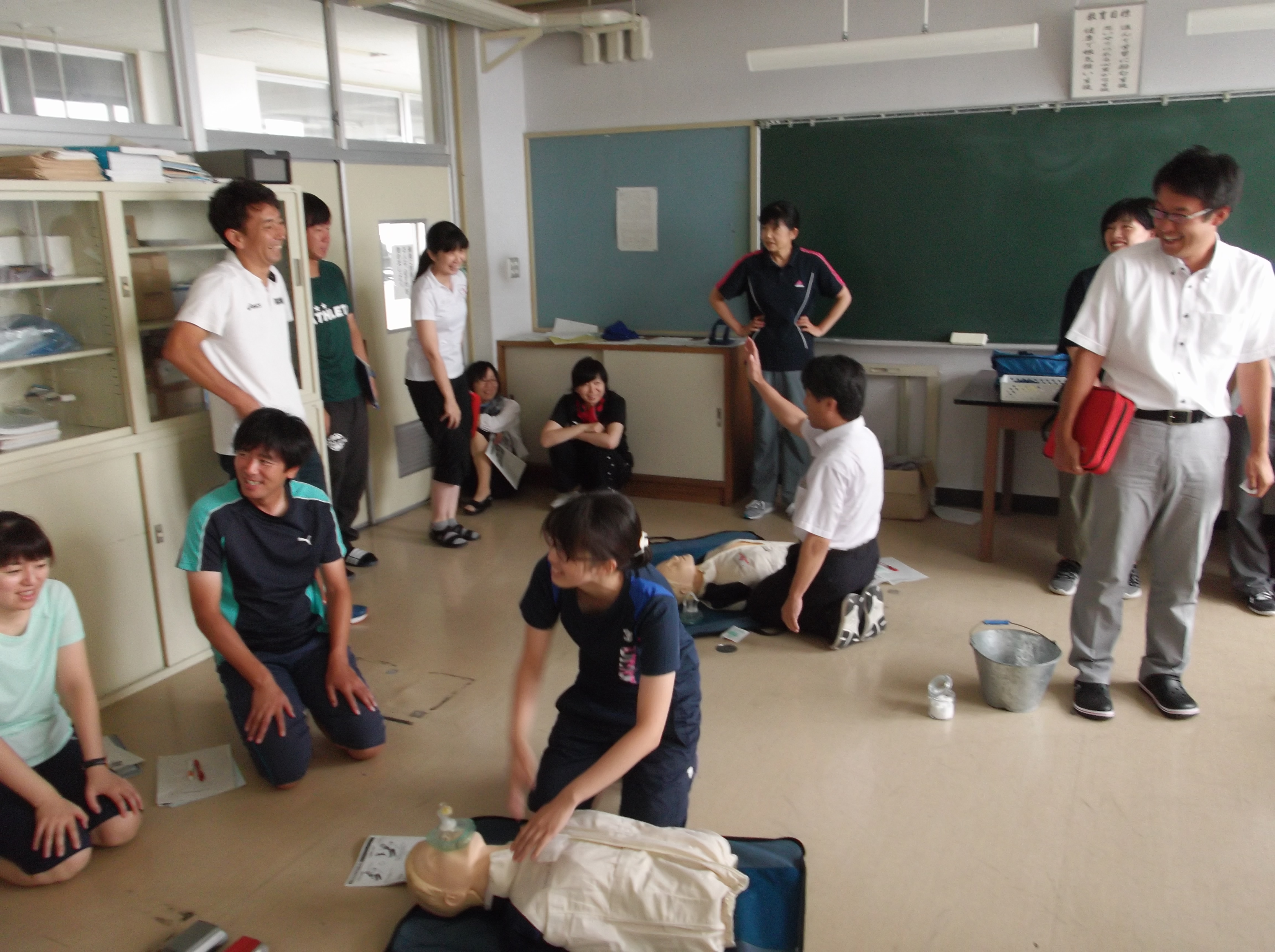 平成30年8月27日(月)14時から、応急手当講習として、心肺蘇生法とAEDの使い方について研修を行いました。講師は、応急手当普及員の資格を持つ本校の養護教諭が務め、市消防本部の講習で使用している資料やDVDを活用しました。