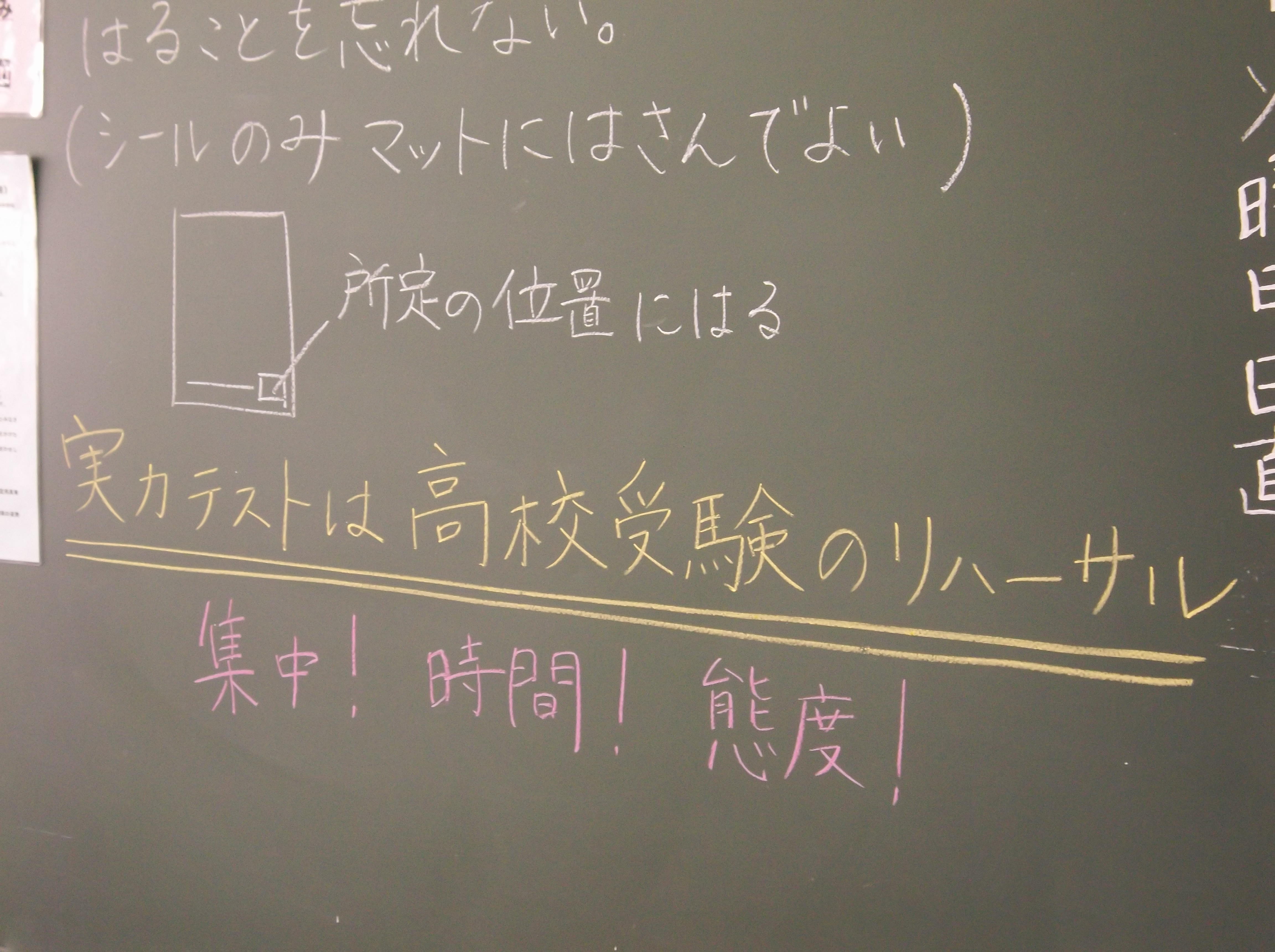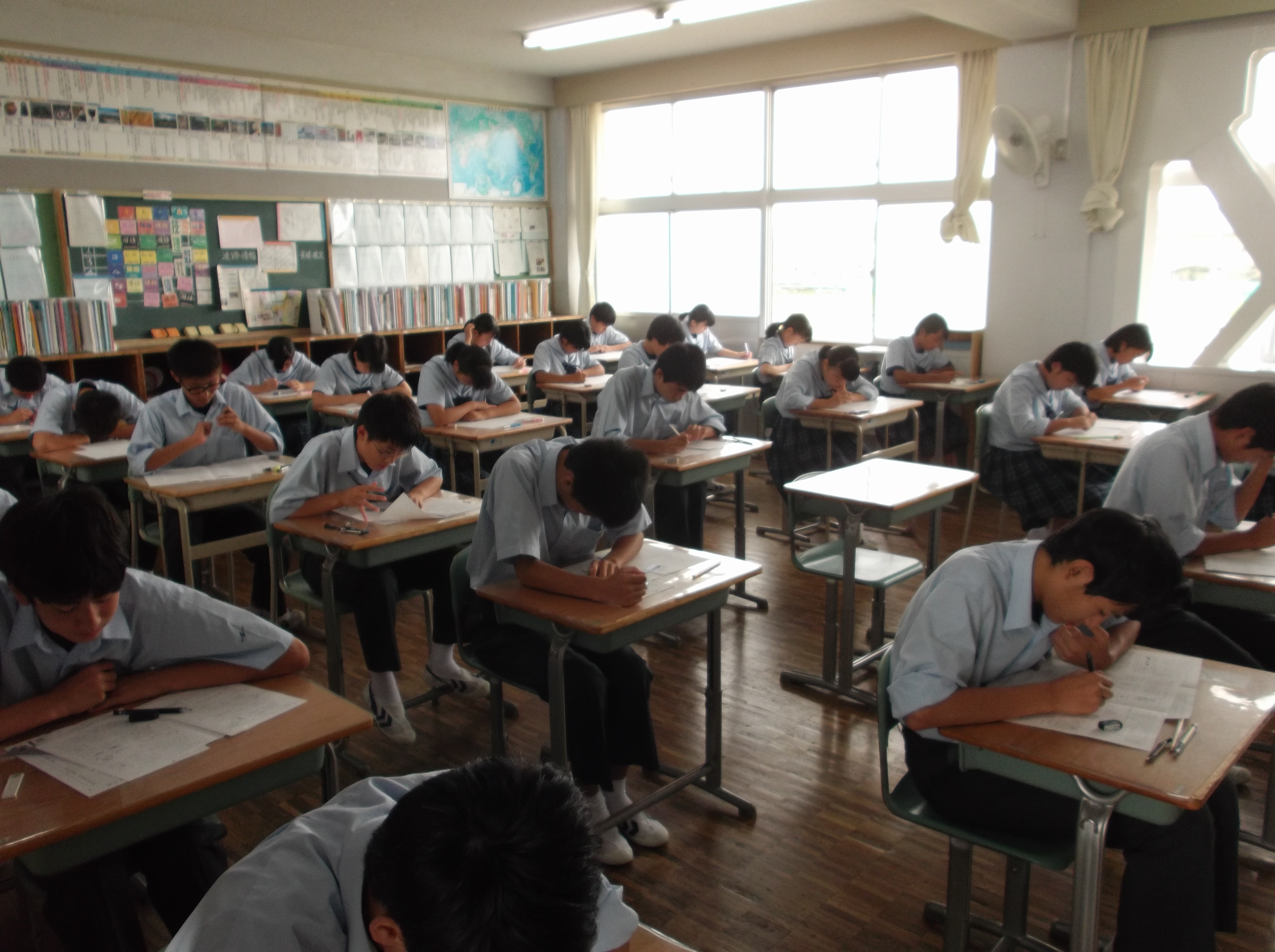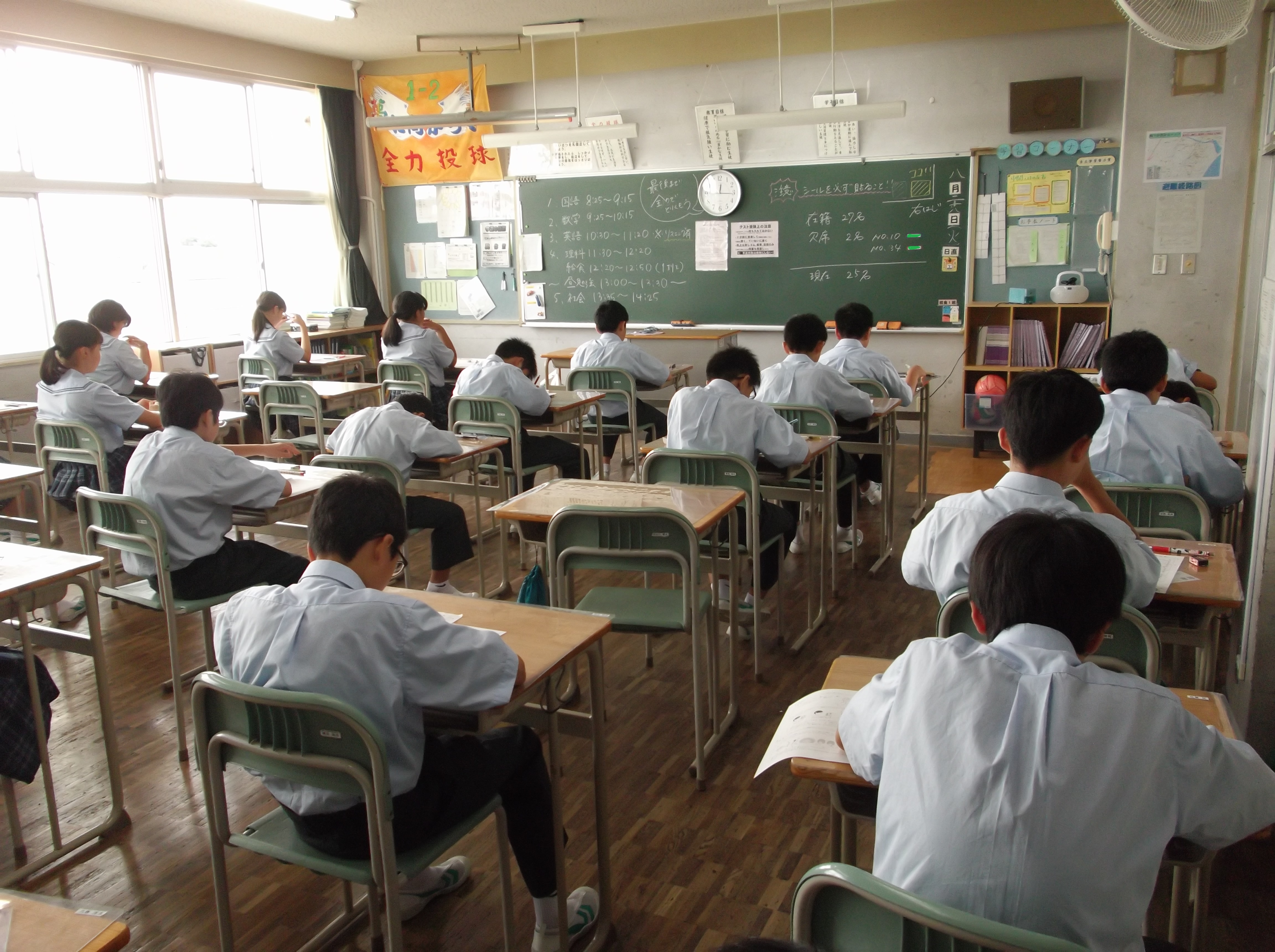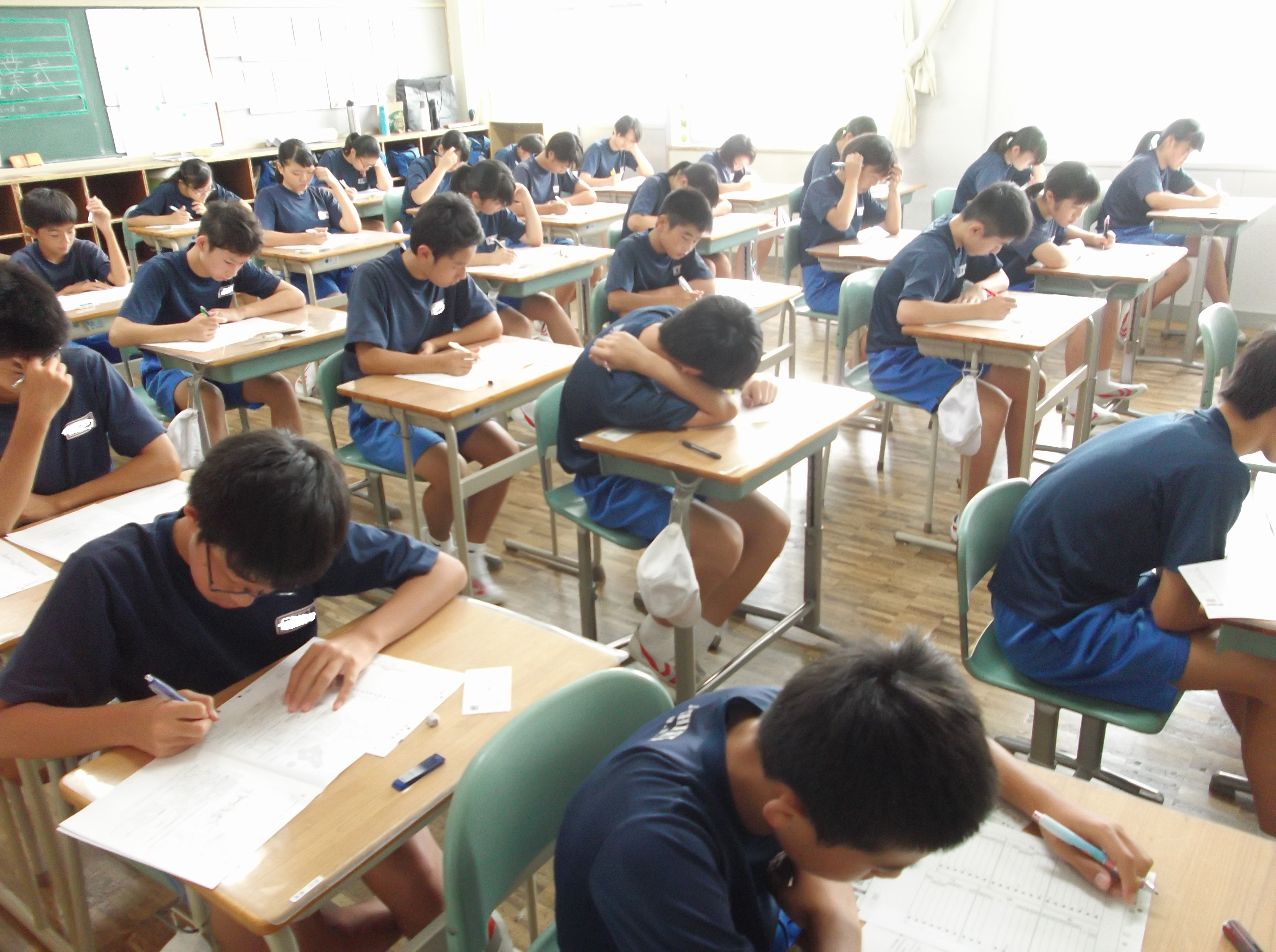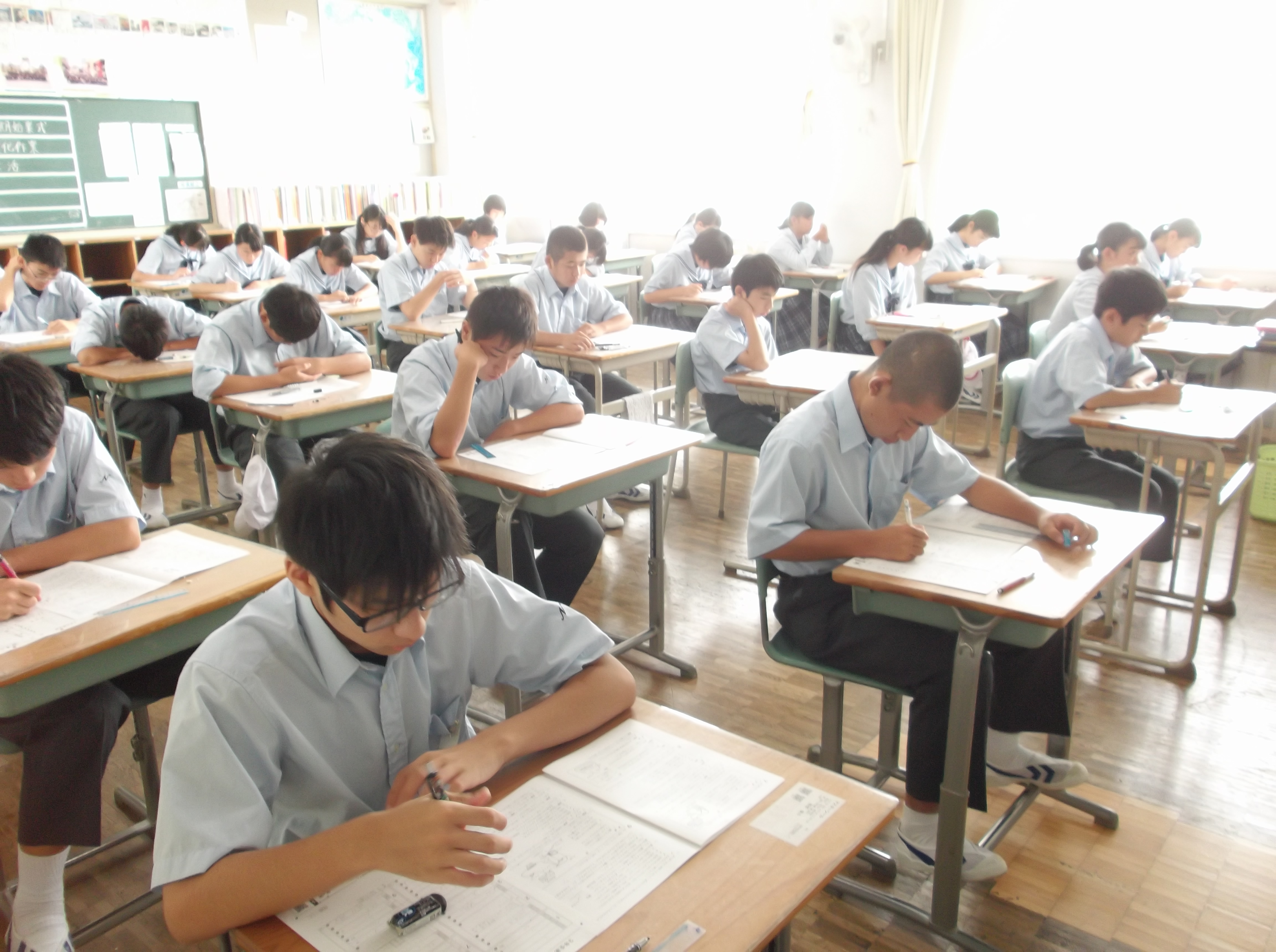 平成30年8月28日(火)、本日は全学年で実力テストに取り組みました。夏休み前に、テスト範囲は知らせてありましたので、学習の成果を期待します。ある教室には、「実力テストは高校受験のリハーサル」集中!時間!態度の文字がありました。