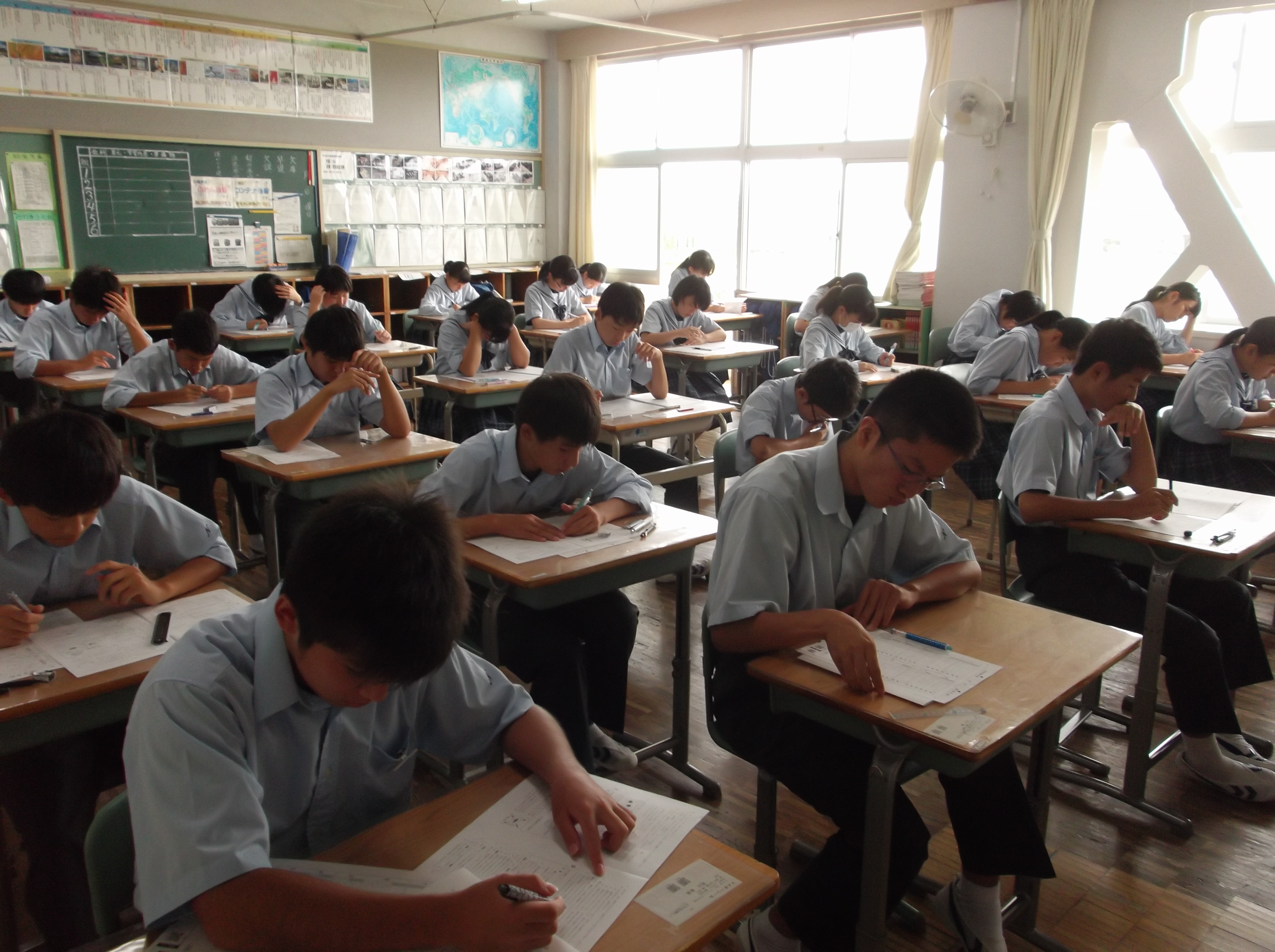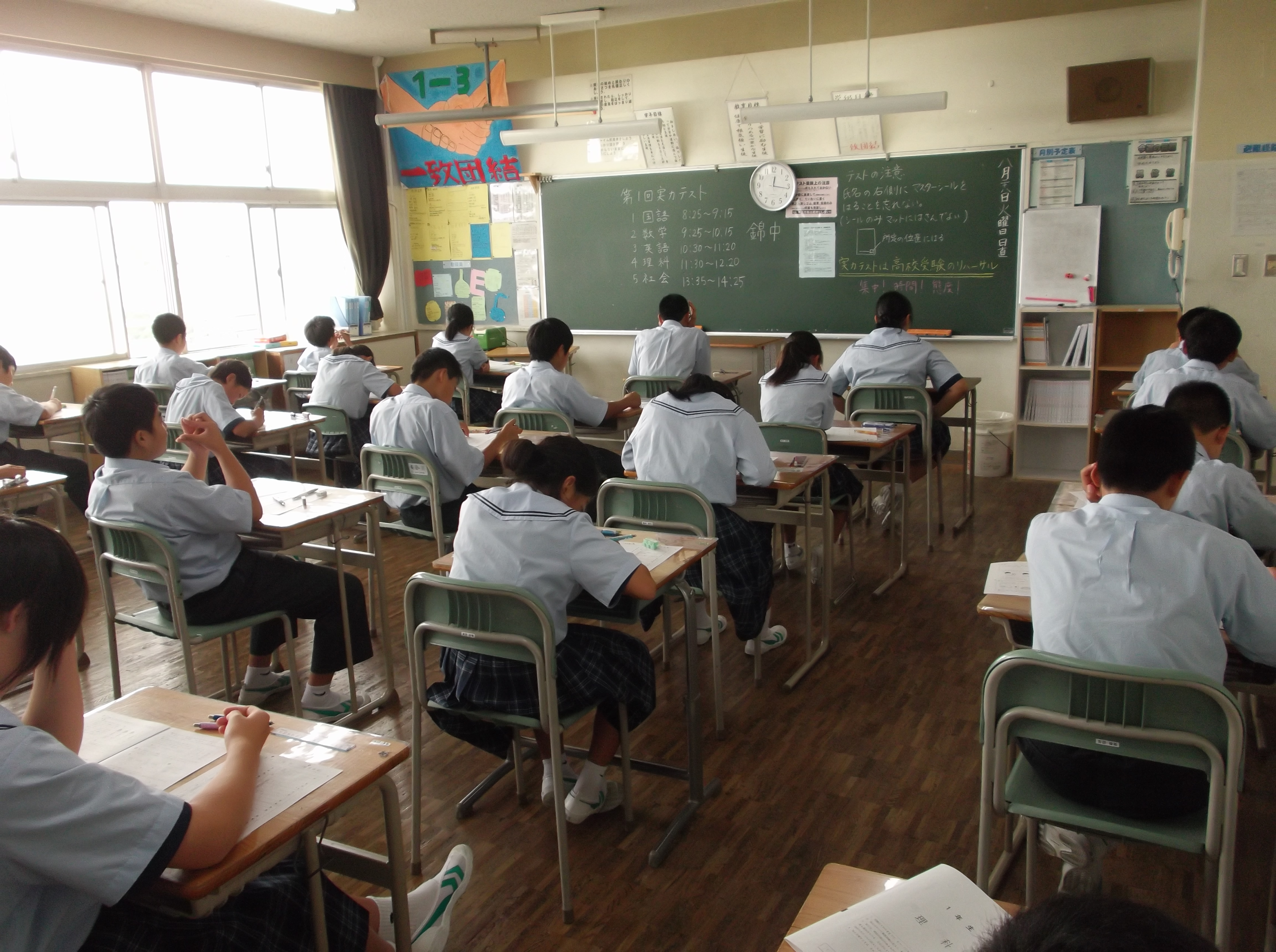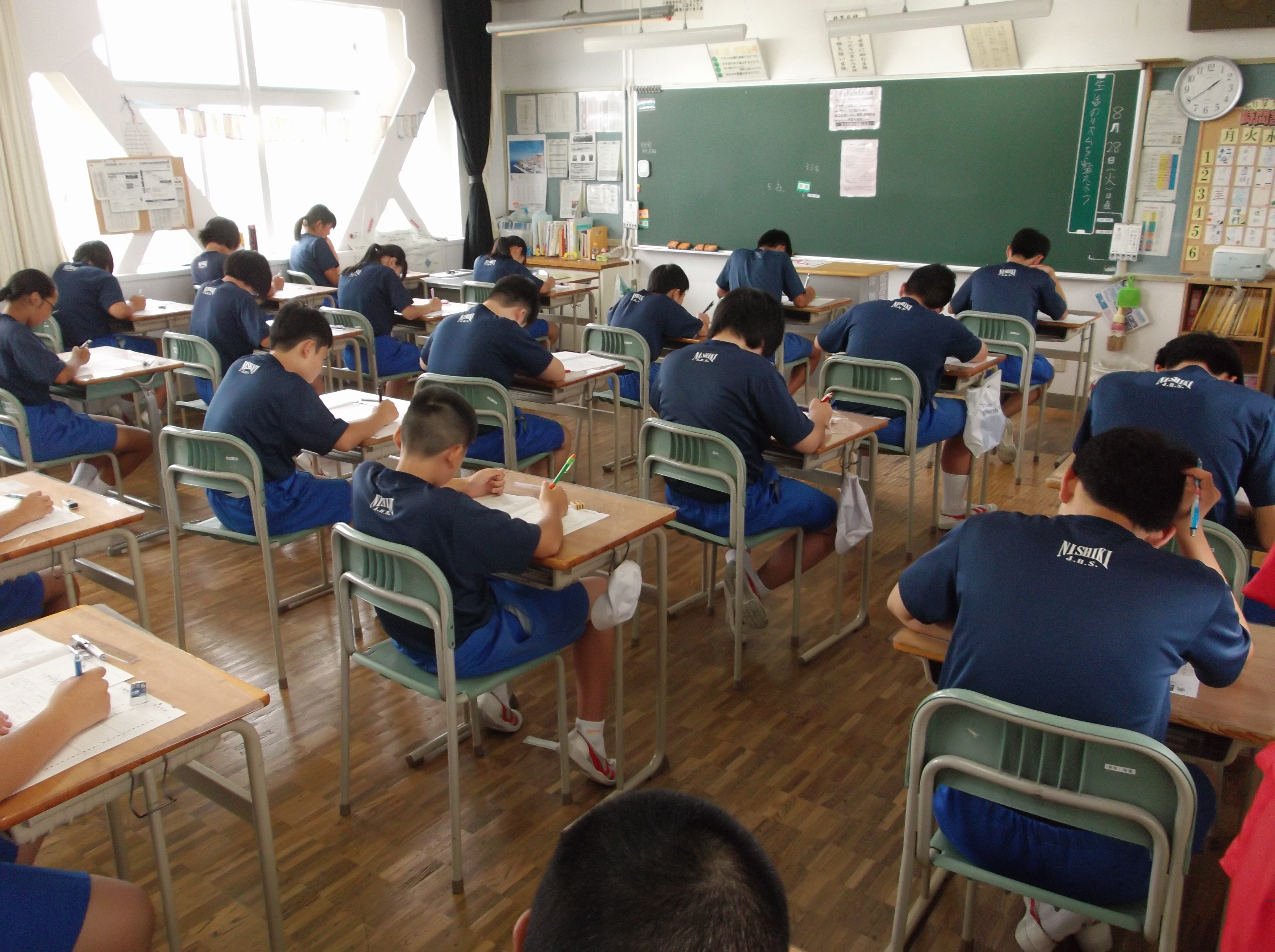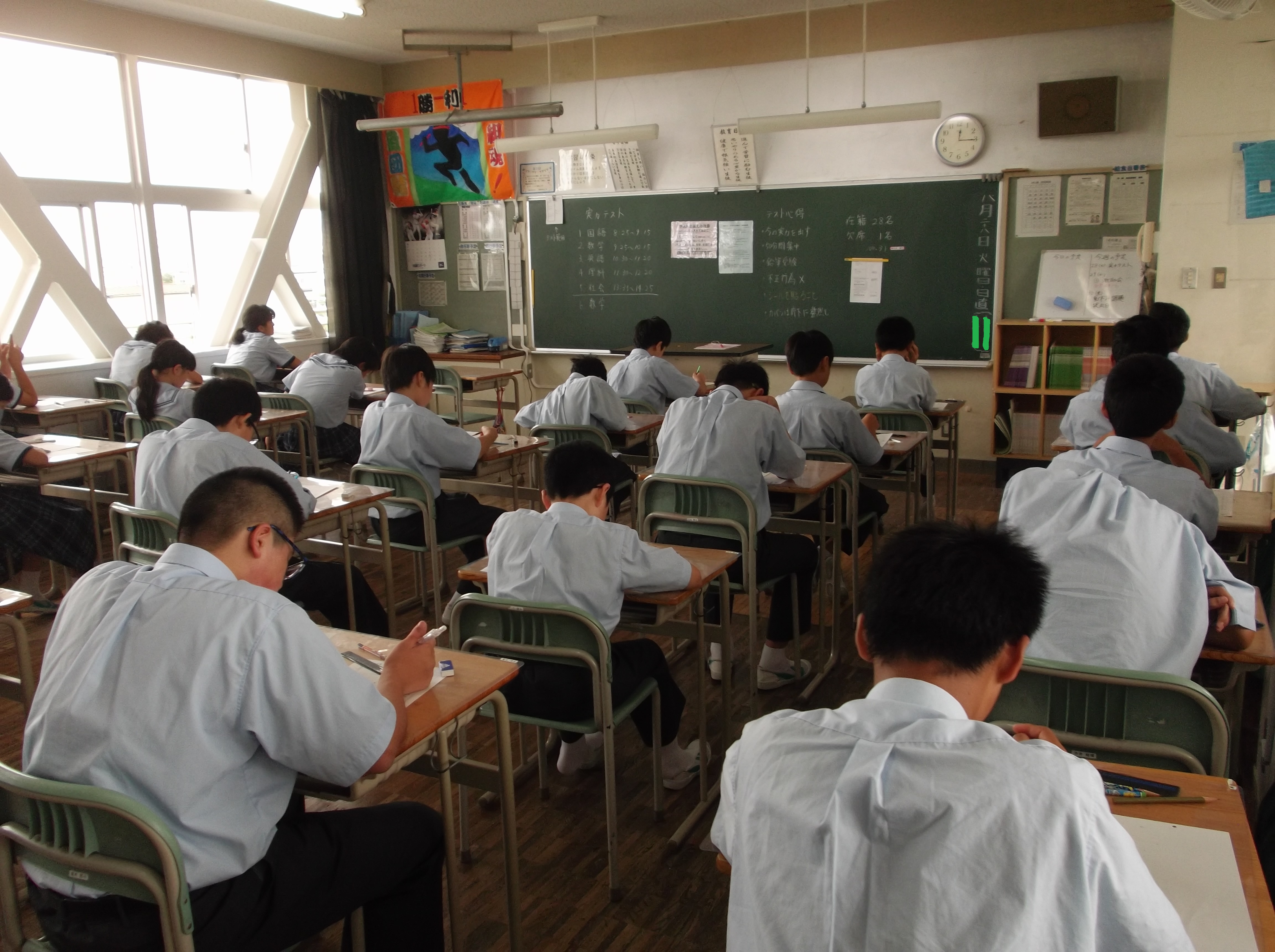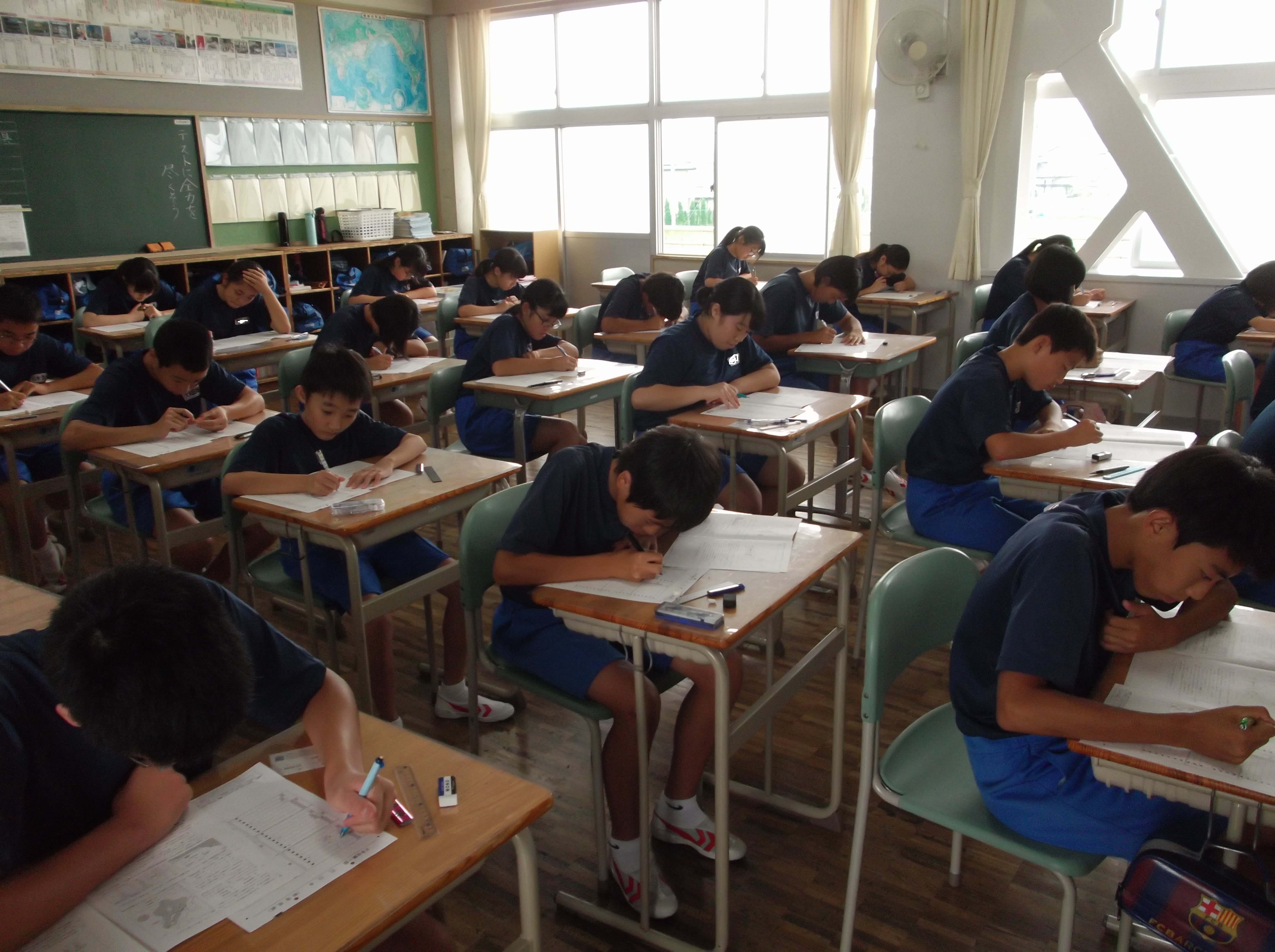 平成30年8月28日(火)、本日は全学年で実力テストに取り組みました。夏休み前に、テスト範囲は知らせてありましたので、学習の成果を期待します。ある教室には、「実力テストは高校受験のリハーサル」集中!時間!態度の文字がありました。