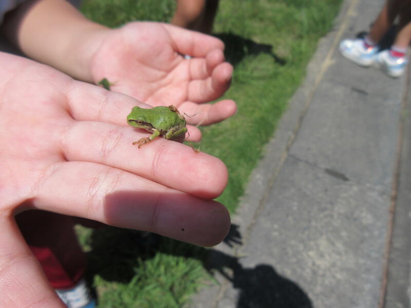 「カエル見つけました!」と近寄ってくる児童がいました。