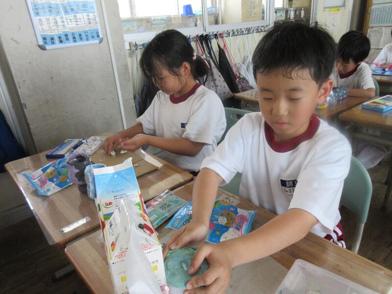 紙粘土に絵の具を混ぜて色をつけ、廃材と合わせて創作を楽しんでいます