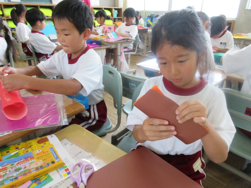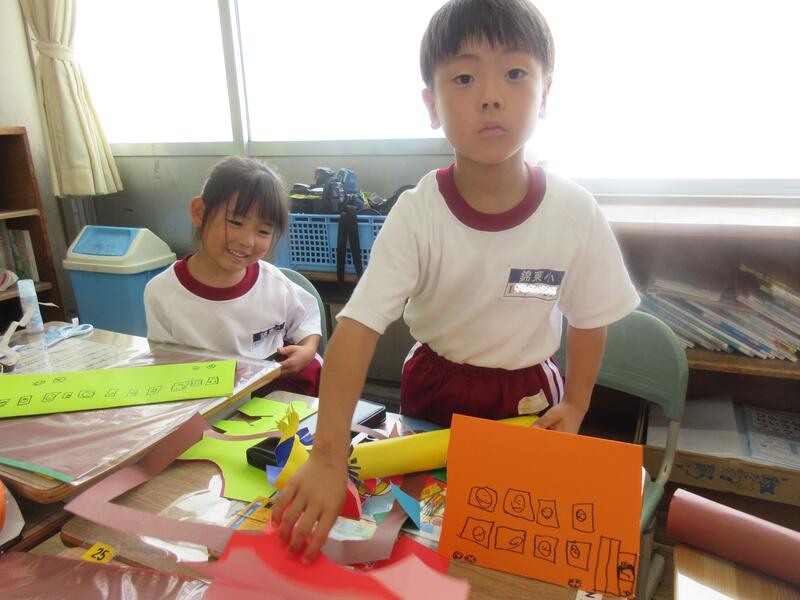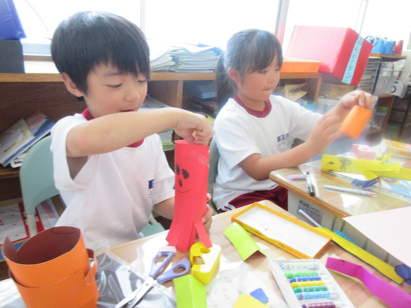 色画用紙を切ったり折ったりまるめたりしながら、立体になる作品を作りました