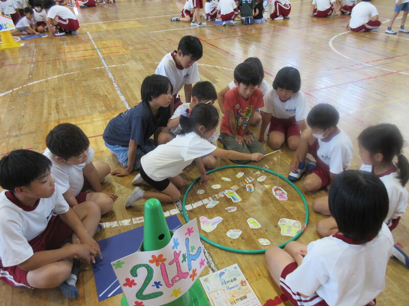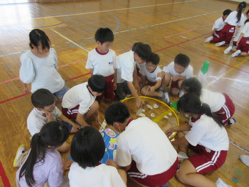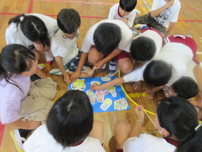 縦割り班ごとに七夕の飾りを魚釣りの要領で集めていきます