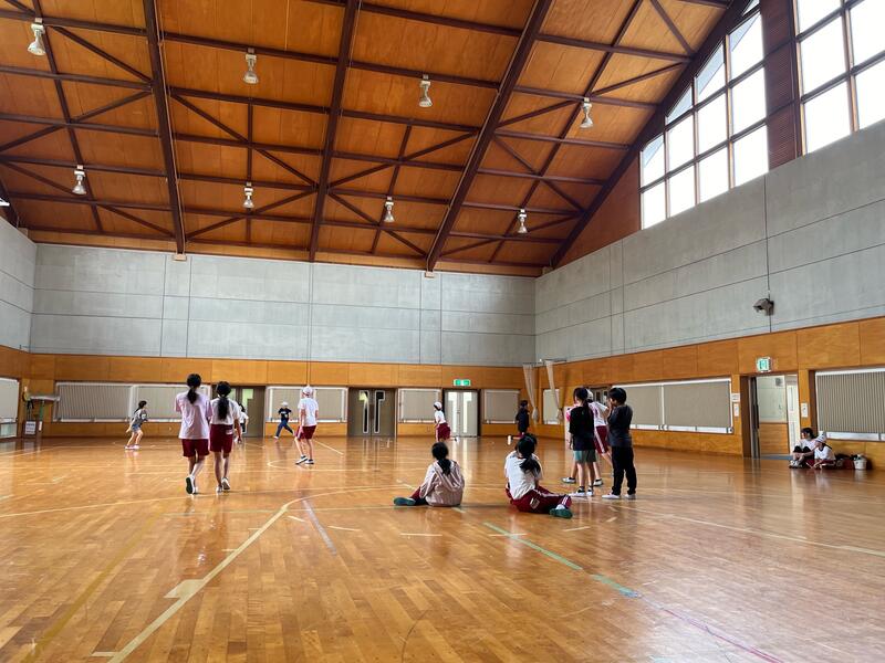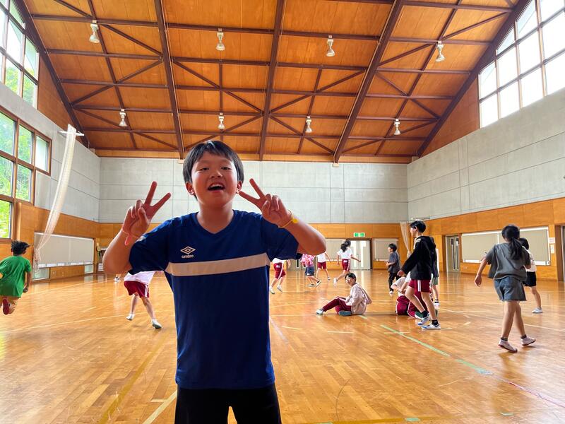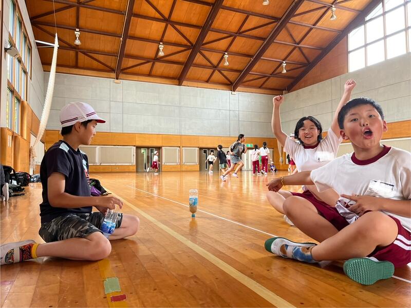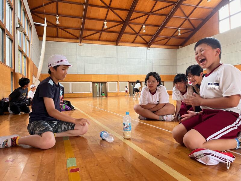 体育館で鬼ごっこをしている子どもたちもいれば、「一回転ペットボトル立て」に挑戦している児童も。