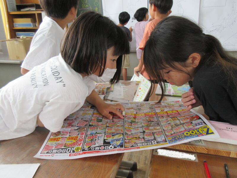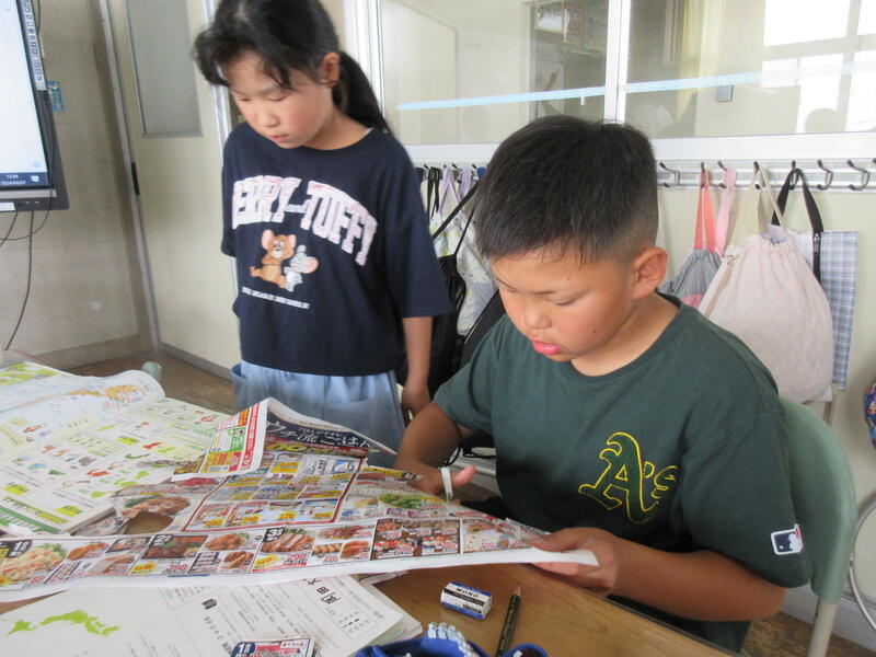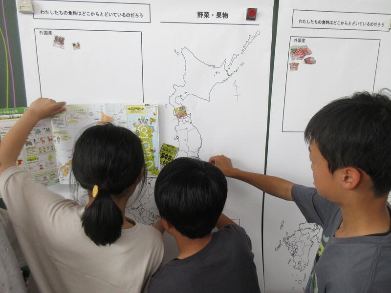 「わたしたちの食料はどこからくるのだろう」という課題の解決のために、スーパーマーケットの広告から産地を見つけ日本地図に貼っていきます