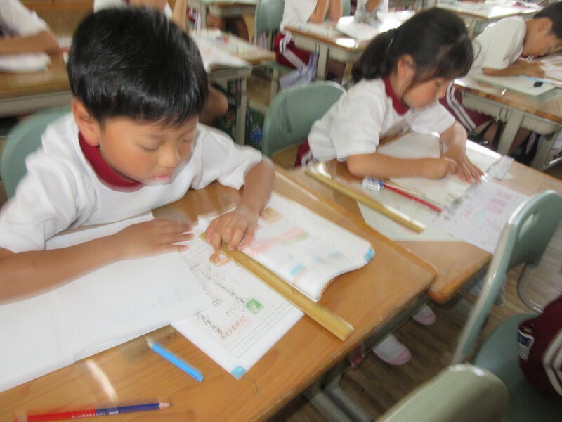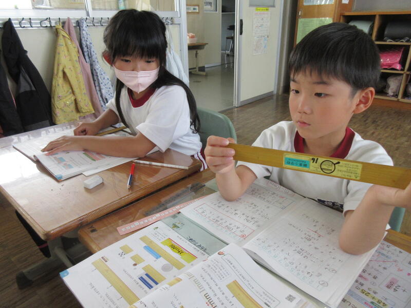 ものさしを使って長さを測定する練習中