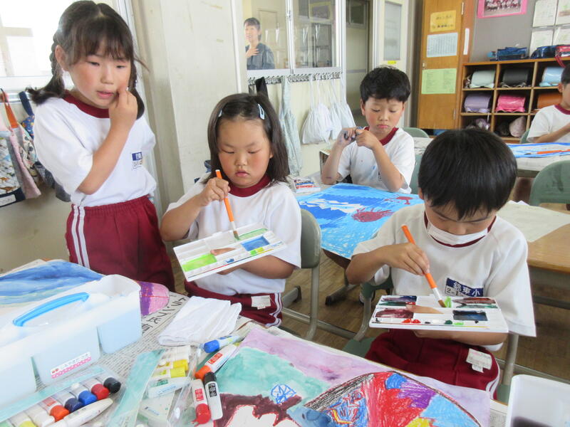 5年生児童は、先日訪れた宿泊学習時のナイトハイクの様子を思い出して描いていました。