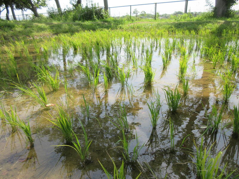 約一か月前に植えた5年生の水田の苗は順調に育っています