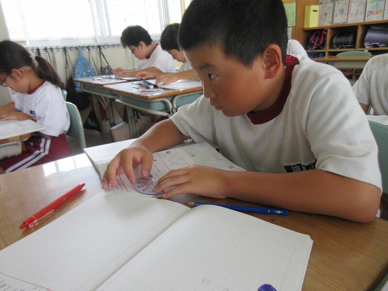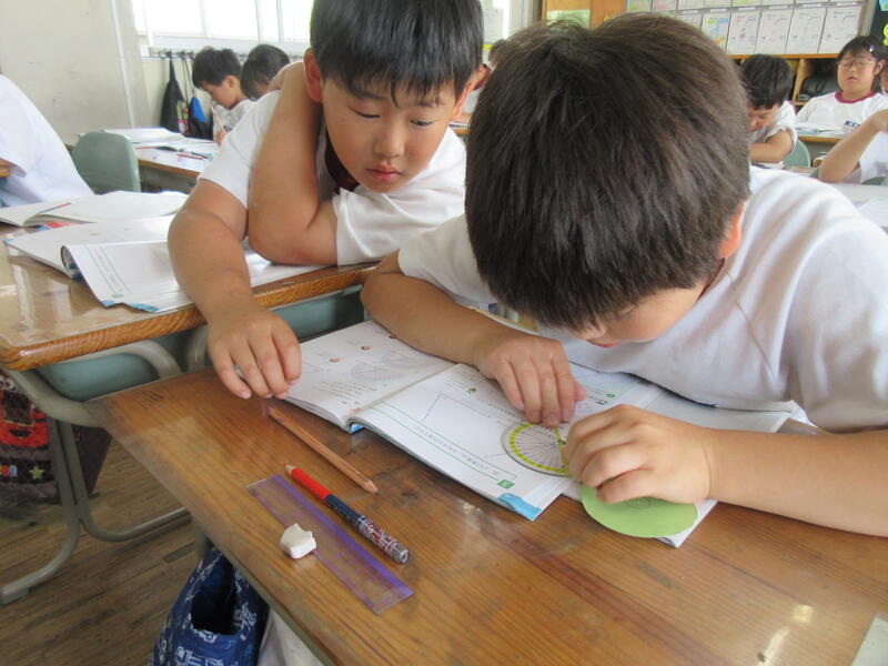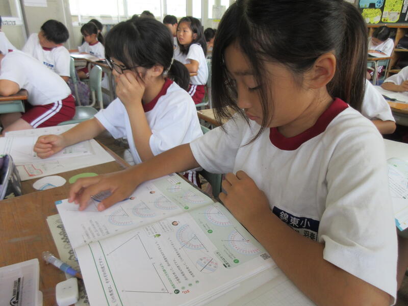 4年生は算数の時間 分度器を使って角度を測りとる学習