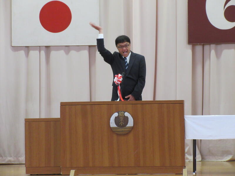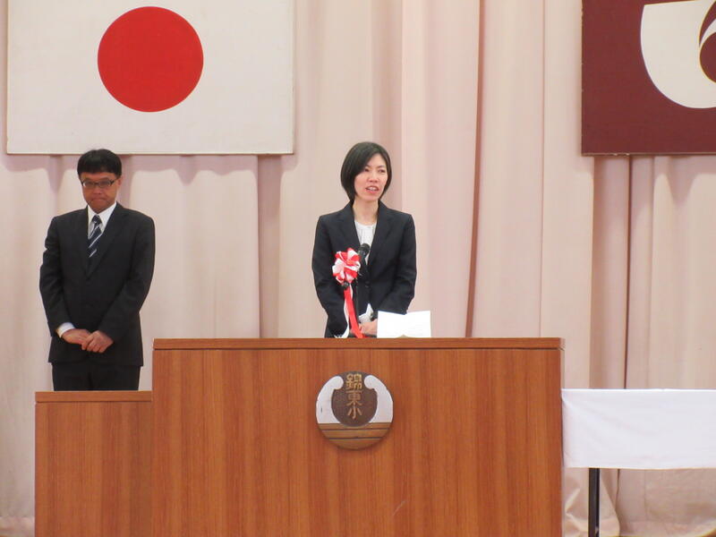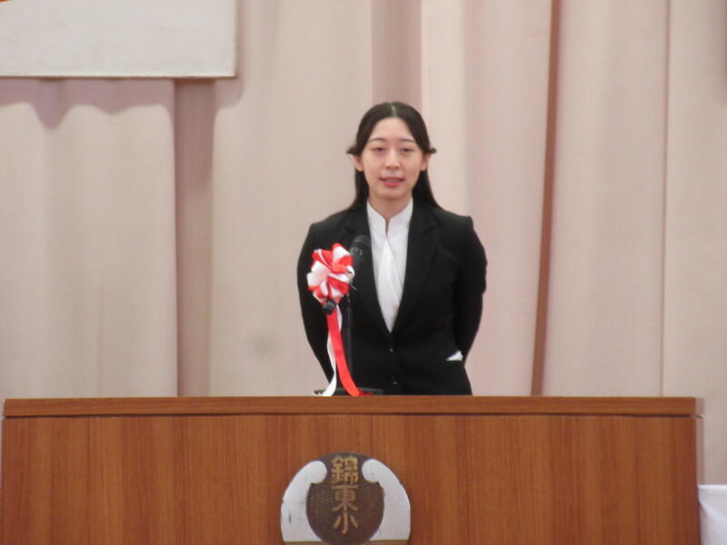 代表児童から「ようこそ!」錦東小学校へ!」のあいさつ
