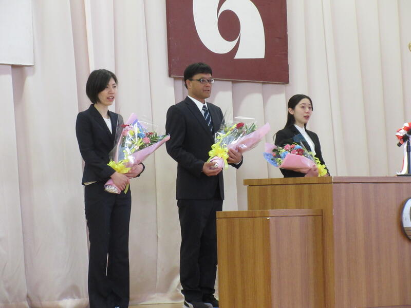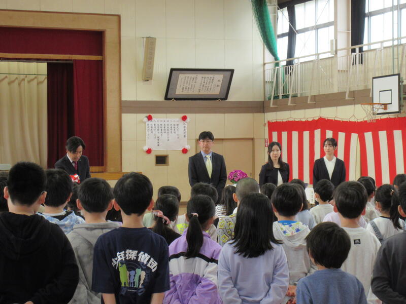 体育館では、はじめに転入職員の着任式を実施しました。3名の先生方としっかりあいさつができました。