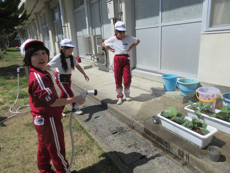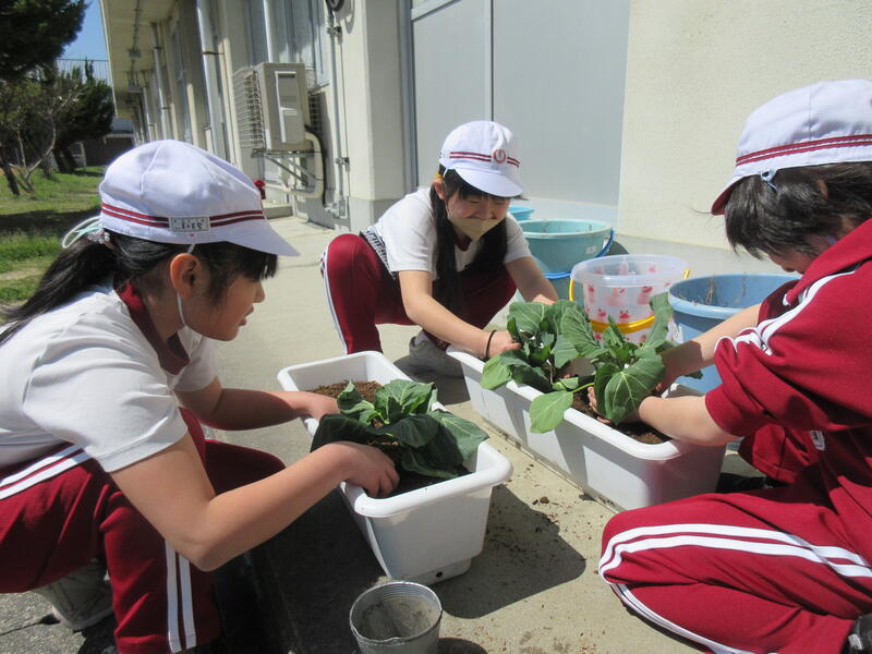 学級清掃の時間3年生の3名にキャベツの苗を植え付けてもらいました。