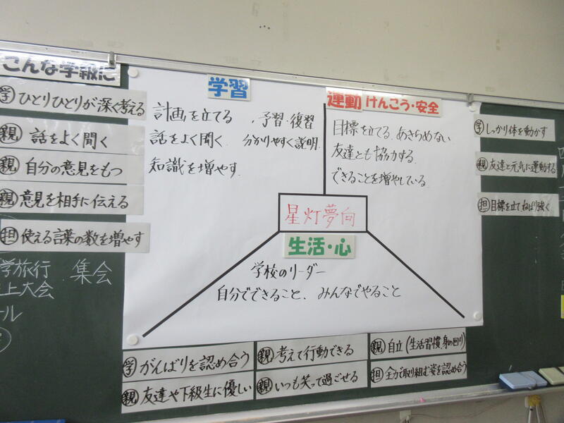その後、学校教育目標、保護者アンケートの結果、担任の願いから、「こんな学級(6年生)になりたい」というクラス目標を設定します。