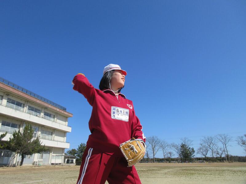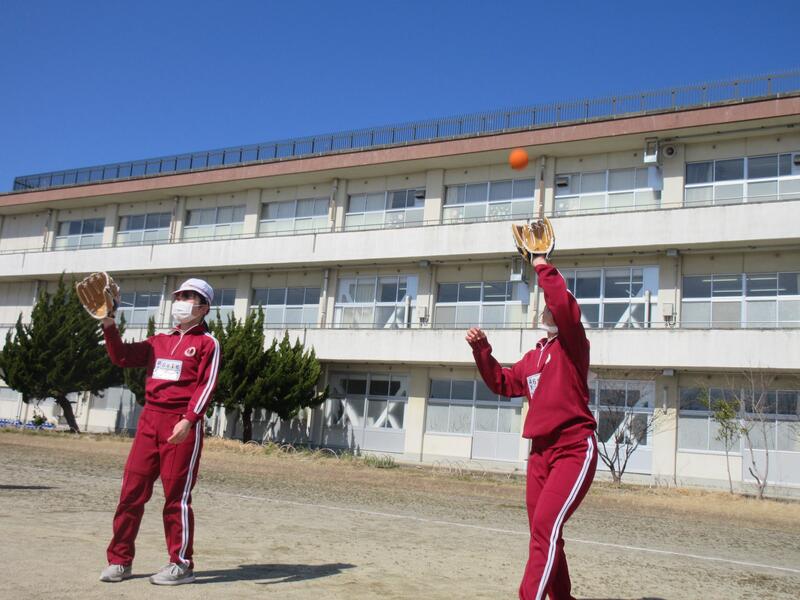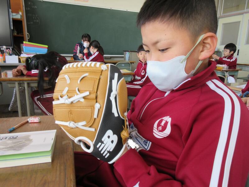 5校時の体育の時間にさっそく校庭で大谷選手グローブでキャッチボールを楽しみました