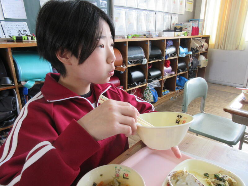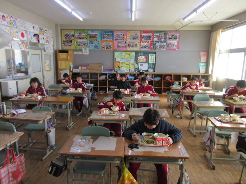 給食の時間も感染症拡大防止のため、一人一人の間隔を空けての食事。