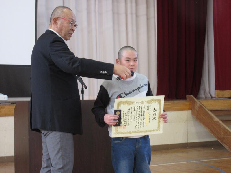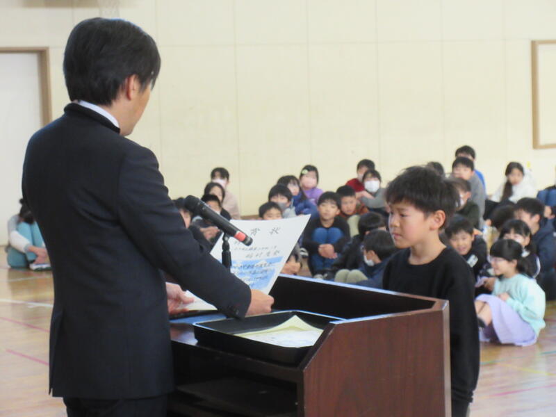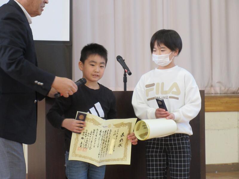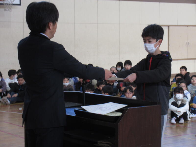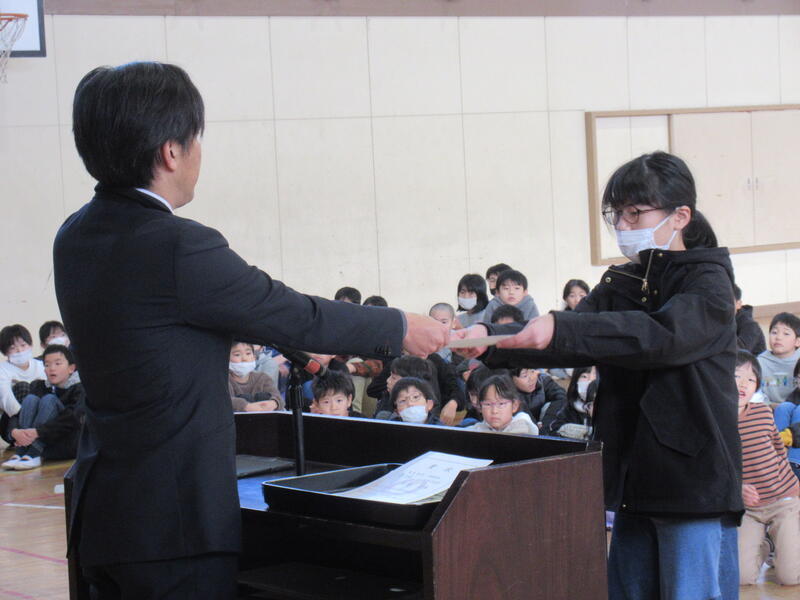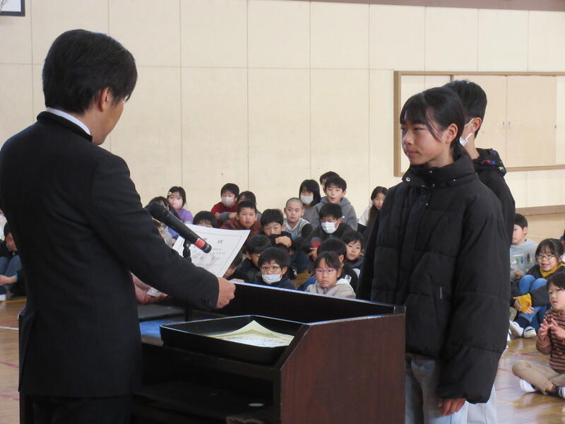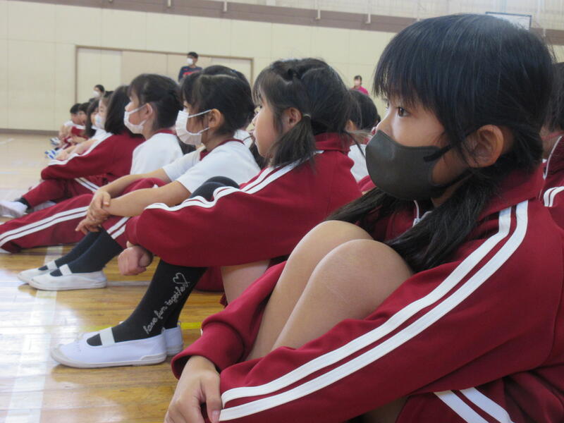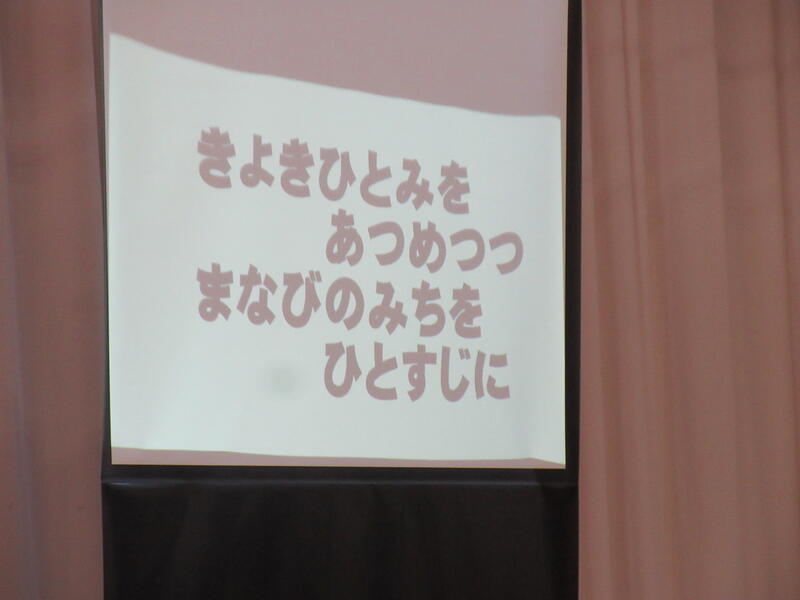 校長からは校歌の一節「大いなる汗流しつつ 鍛える体健やかに」「清きひとみを集めつつ 学びの道を一筋に」から、健康な身体作りに取り組んでいる様子やひとみを輝かせて学びに取り組んでいる姿について紹介しました。