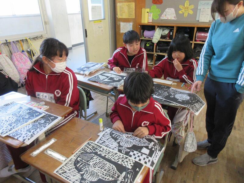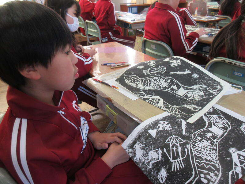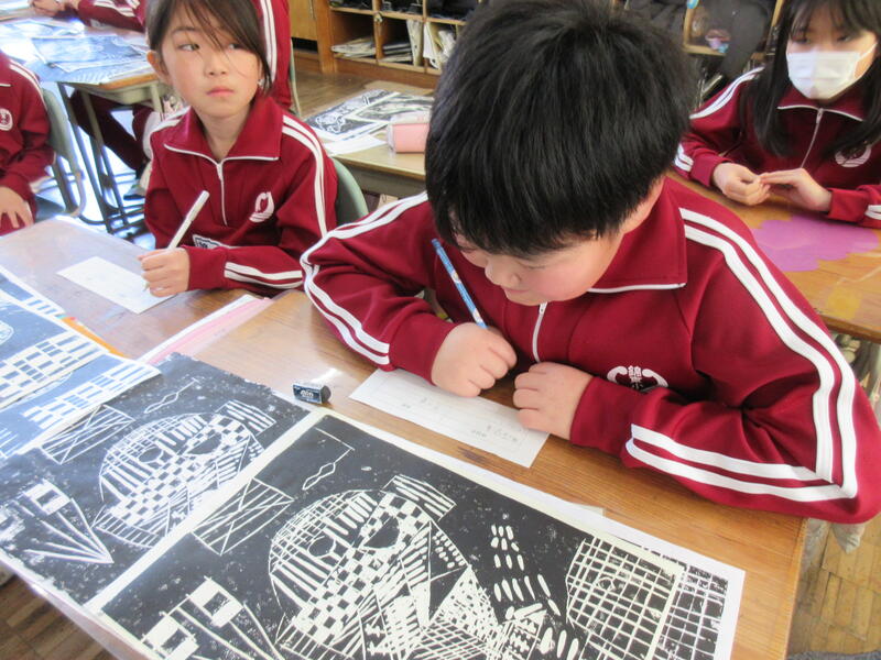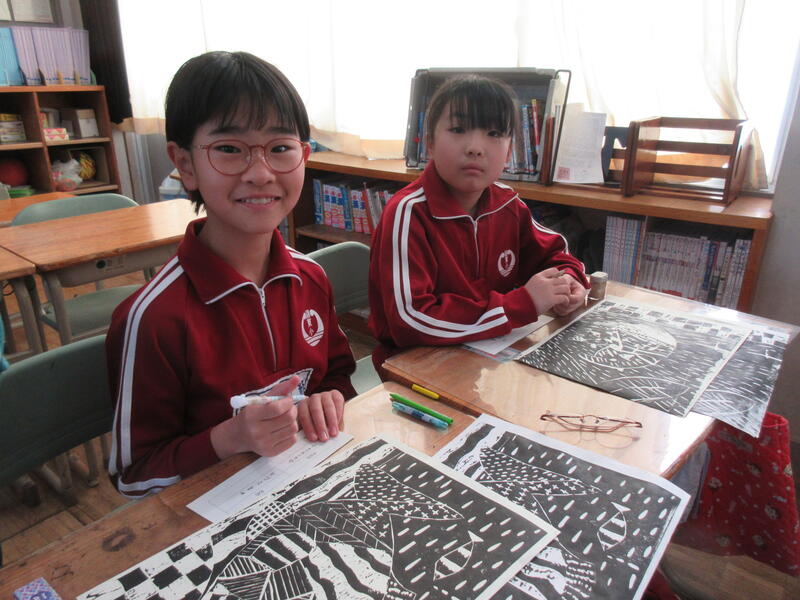 4校時 4年生は図工の時間 2学期から取り組んでいた木版画が刷り上がり、自己評価をしていました。