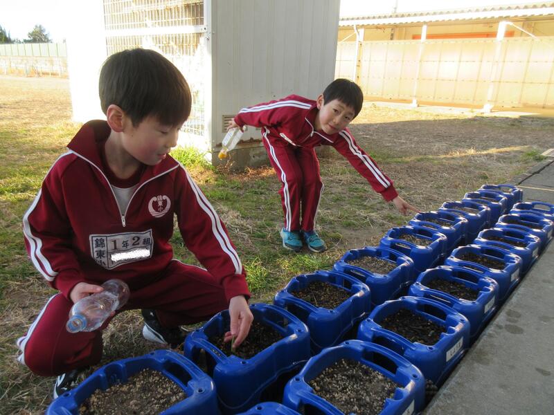 厳しい朝の冷え込みが続いていますが、低学年の児童は着替えが終わると植物のお世話に外へやってきます。