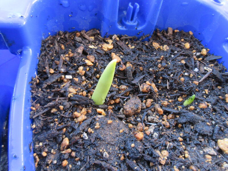 1年生はチューリップの球根を育てています。「見てください!」と、指さした先にはすでに芽が出てきていました。