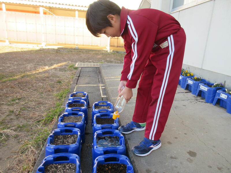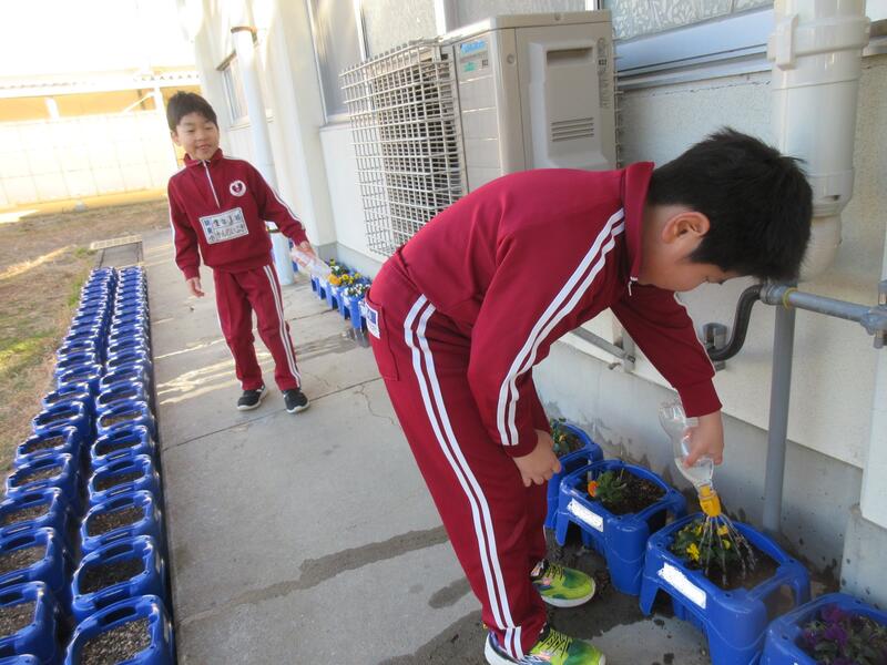 2年生はビオラの苗に水をあげています。花苗といっしょに自然愛護の優しい気持ちも育っています。