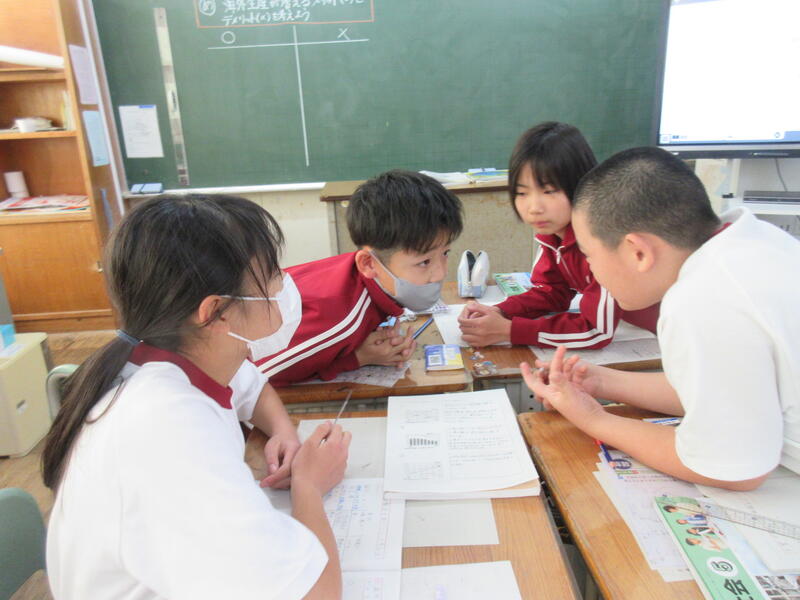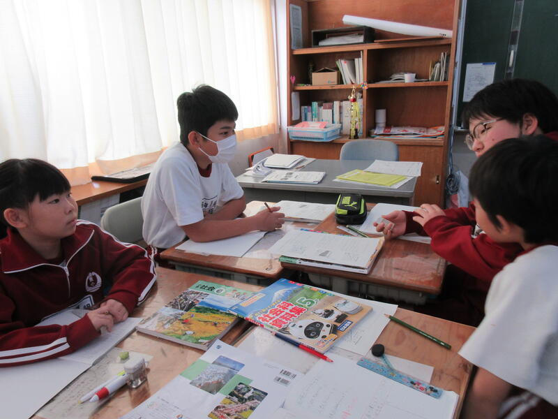グループごとに会社の経営陣になったつもりで「社内会議」。「関税がかからない分やすくできる」「海外の人たちは信用できるか」「輸送のお金が安くすむのでは」等など、これまでの学習を生かした考えがたくさん出てきました。