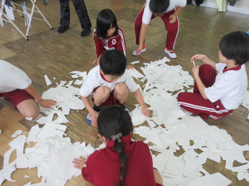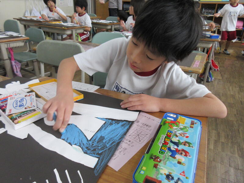 2年生は図画工作の時間 はさみで切った紙の形を生かして作品作りをしました