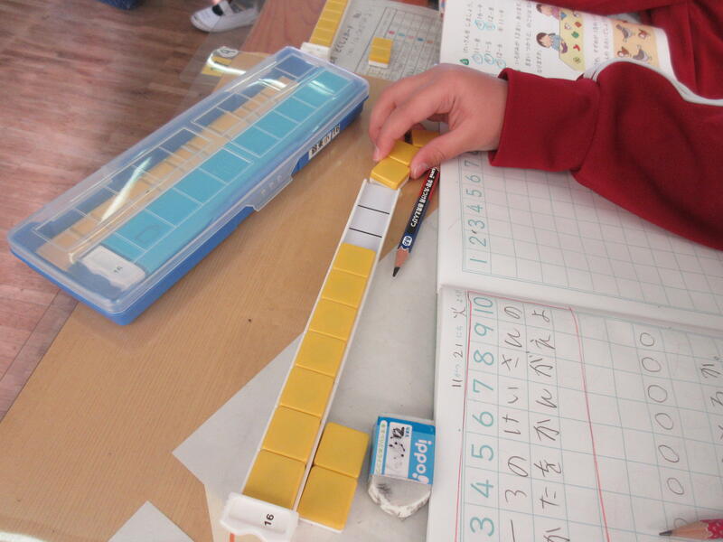 繰り下がりの引き算の基礎の学習は、数字だけで考えることが難しいためブロックを使って考えていくことが有効となります。担任からはブロックをケーキに見立てて「3つ食べちゃうと~」と声かけがありました。