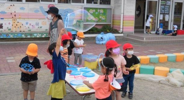 砂糖を入れたので いつもより壊れにくく 大きなシャボン玉になって・・・大喜び。