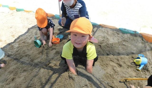 砂の中に足や手を入れて 感触を楽しんでいました。