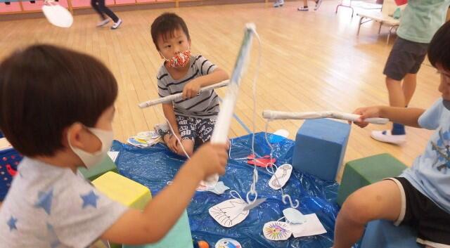 下(左)は、年長さんの魚釣りに まぜてもらっている年少さんです。