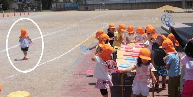 左の女の子は、シャボン玉を追いかけて 走っていました。「待て~っ」