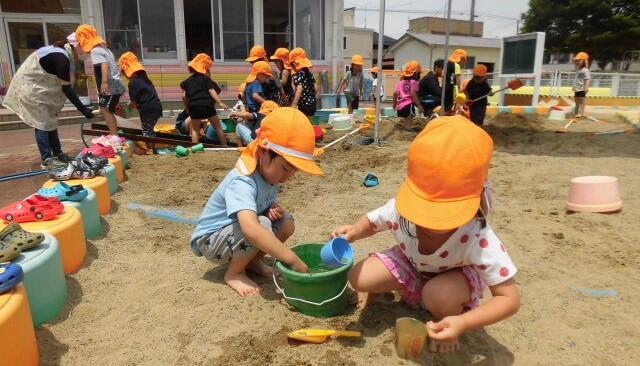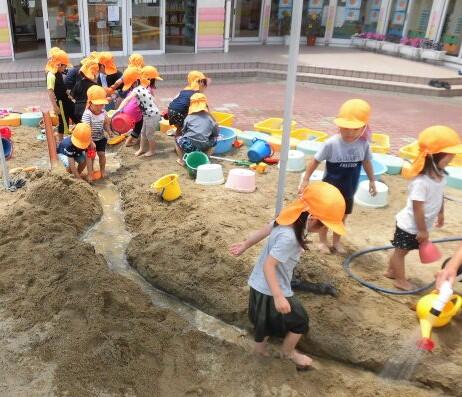 2021年6月22日 13時18分6月22日(火)晴れ。年少さんは・・・泥水遊び。