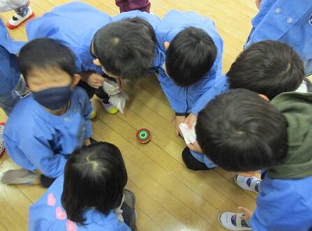 式終了後・・・・年長の担任の先生が コマを回してくれました。