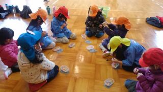 松ぼっくりを籠にめがけて『エイ!』『ビーズ通し』で一休み。