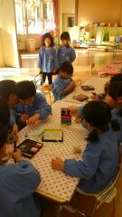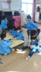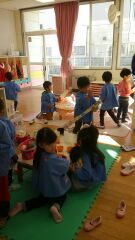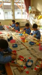 糸引き独楽に色を塗って、回すことに挑戦。 ままごとや、紙で剣を作って戦いごっこ。