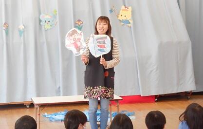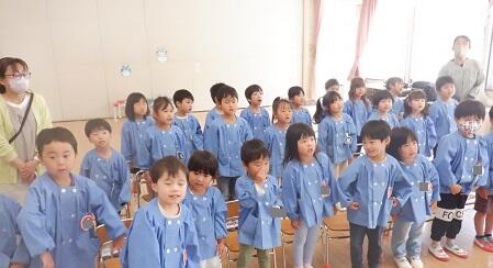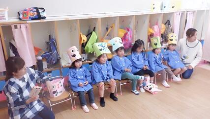 今日の集会は・・・年少さんは、年少さんの保育室で行いました。