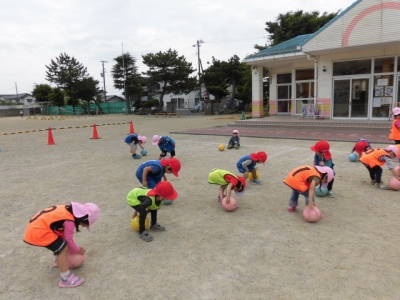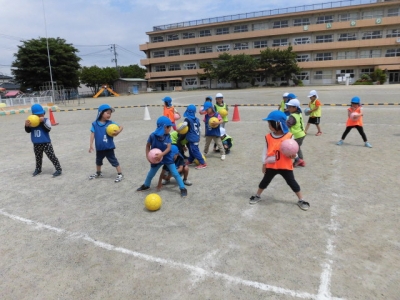 他にも、友だちの足の間にボールを手で転がしたり、蹴ったりして楽しみました。最後まで諦めずに取り組む姿が素晴らしかったです。